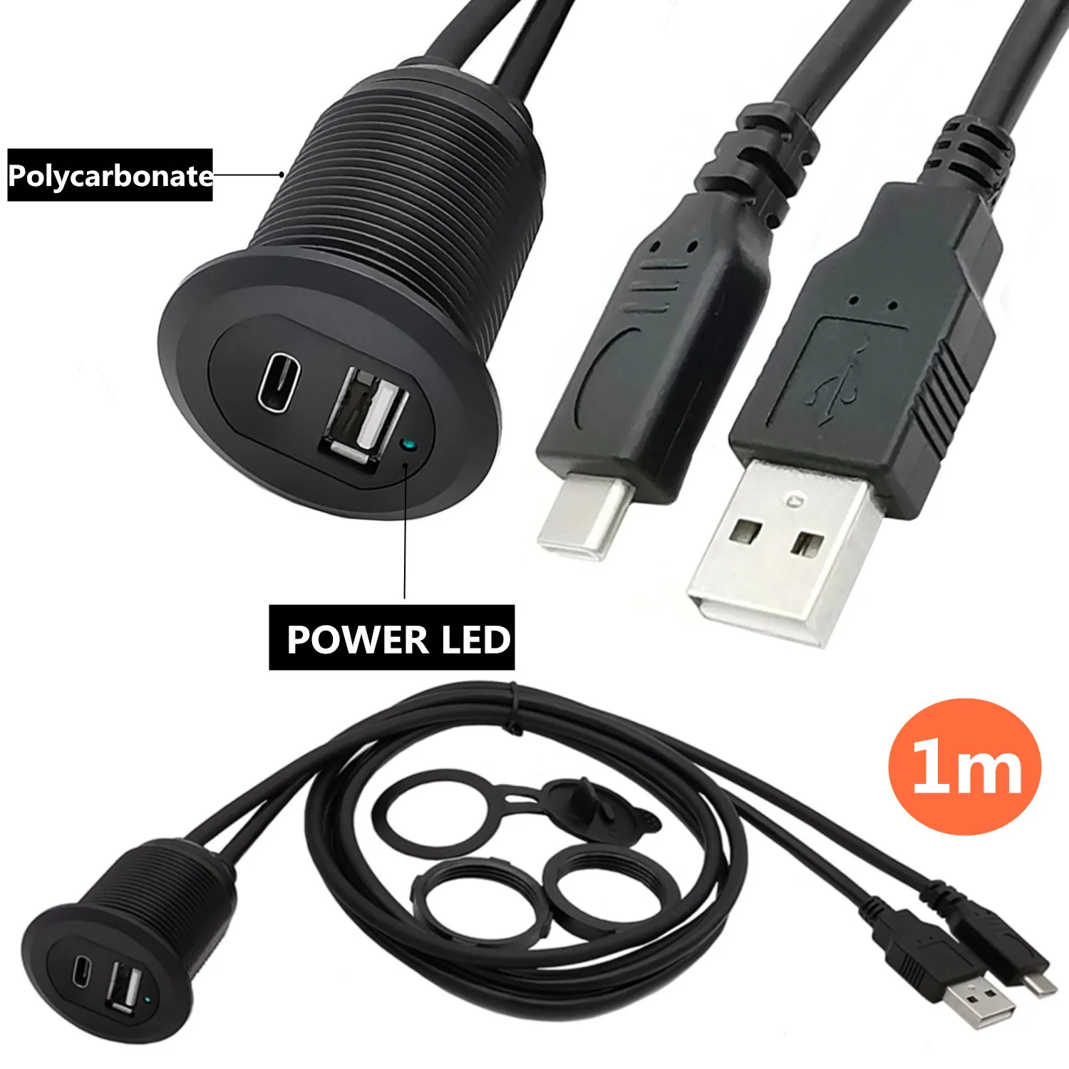 Luz LED C 2,0 y USB 2,0 macho a hembra AUX cable de lavado de coche cable de extensión impermeable para camión de coche, panel de salpicadero de motocicleta Marina 1m/2m;