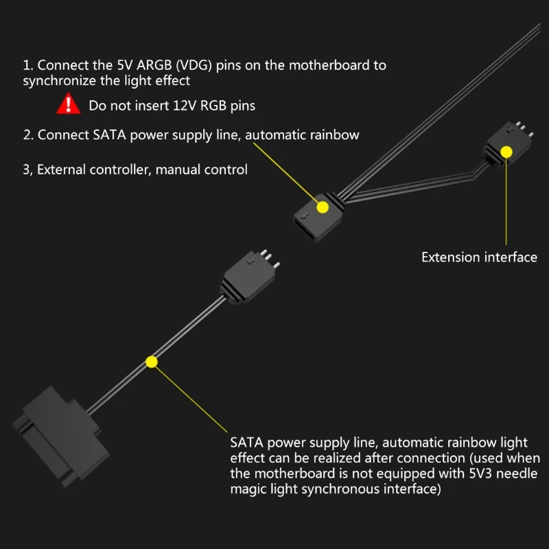 Cuando la placa base no tiene un pin de sincronización ARGB de 5V, use el cable de alimentación SATA adjunto para conectarse a la interfaz SATA de alimentación para lograr un efecto de luz arcoíris automático.