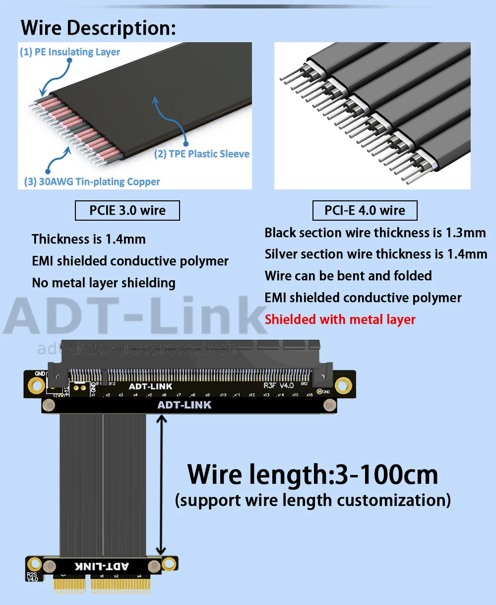 El cable es la cuarta generación del cable dedicado ADT PCIe. El grosor del cable negro es de 1,3mm, el cable plateado es de 1,4mm y el cable azul es de 0,85mm. El cable se puede doblar y plegar sin afectar el uso.