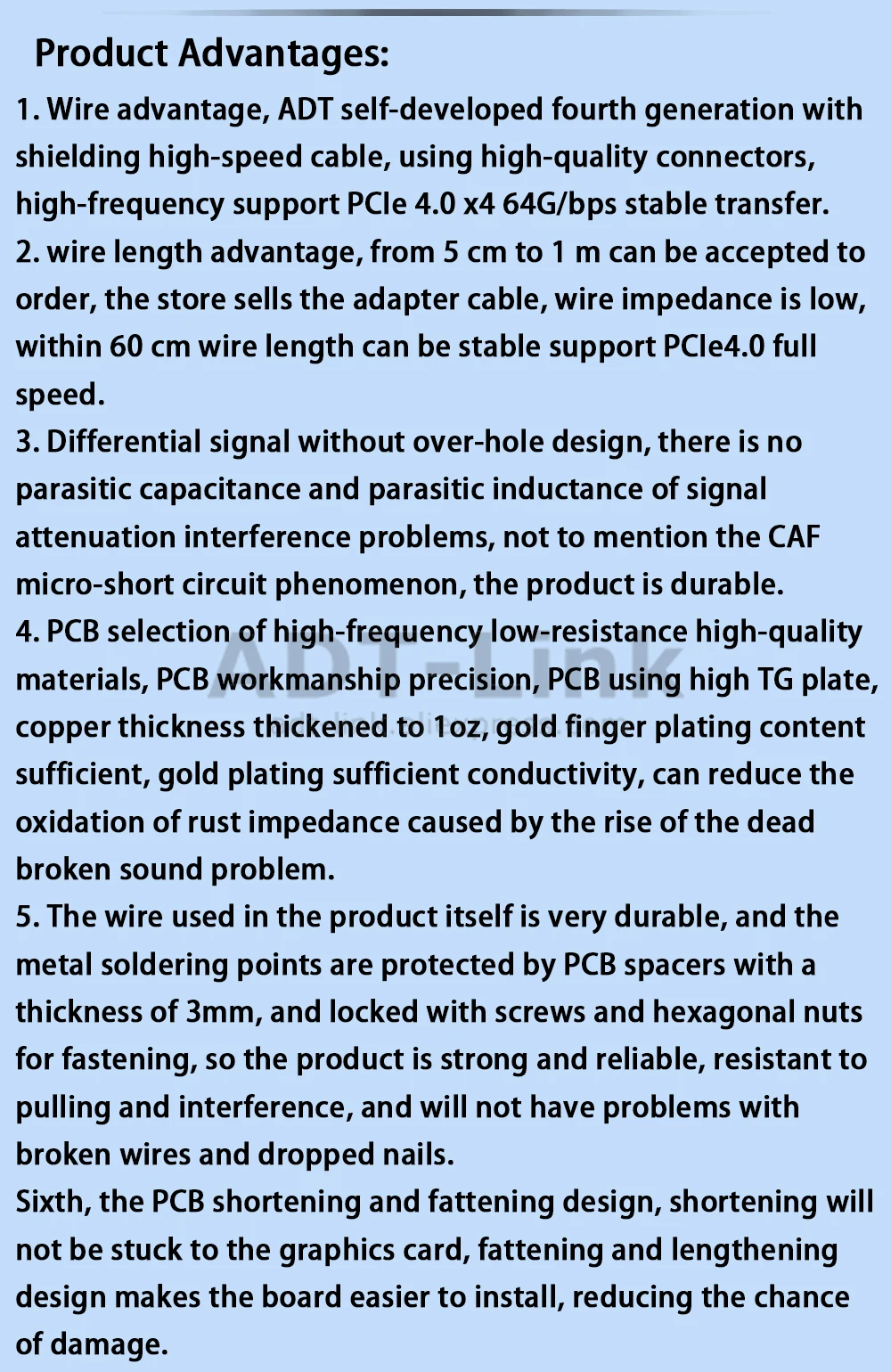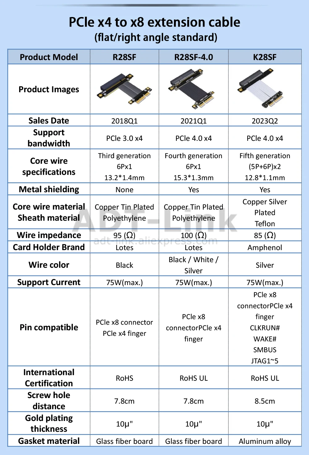 ModelosDescripcionesK28SFPCIe 4,0x4 a x8 Férula de 180 grados plana y rectaRestricciones de uso: PCIe 4,0 tiene altos requisitos en el equipo. Mientras el cable de extensión esté conectado, la señal se atenuará. Este producto no garantiza la velocidad completa de PCI-E 4,0. El equipo está envejecido. Si la señal es pobre o el entorno no es bueno, reduzca la velocidad a PCIe 3,0 o inferior.