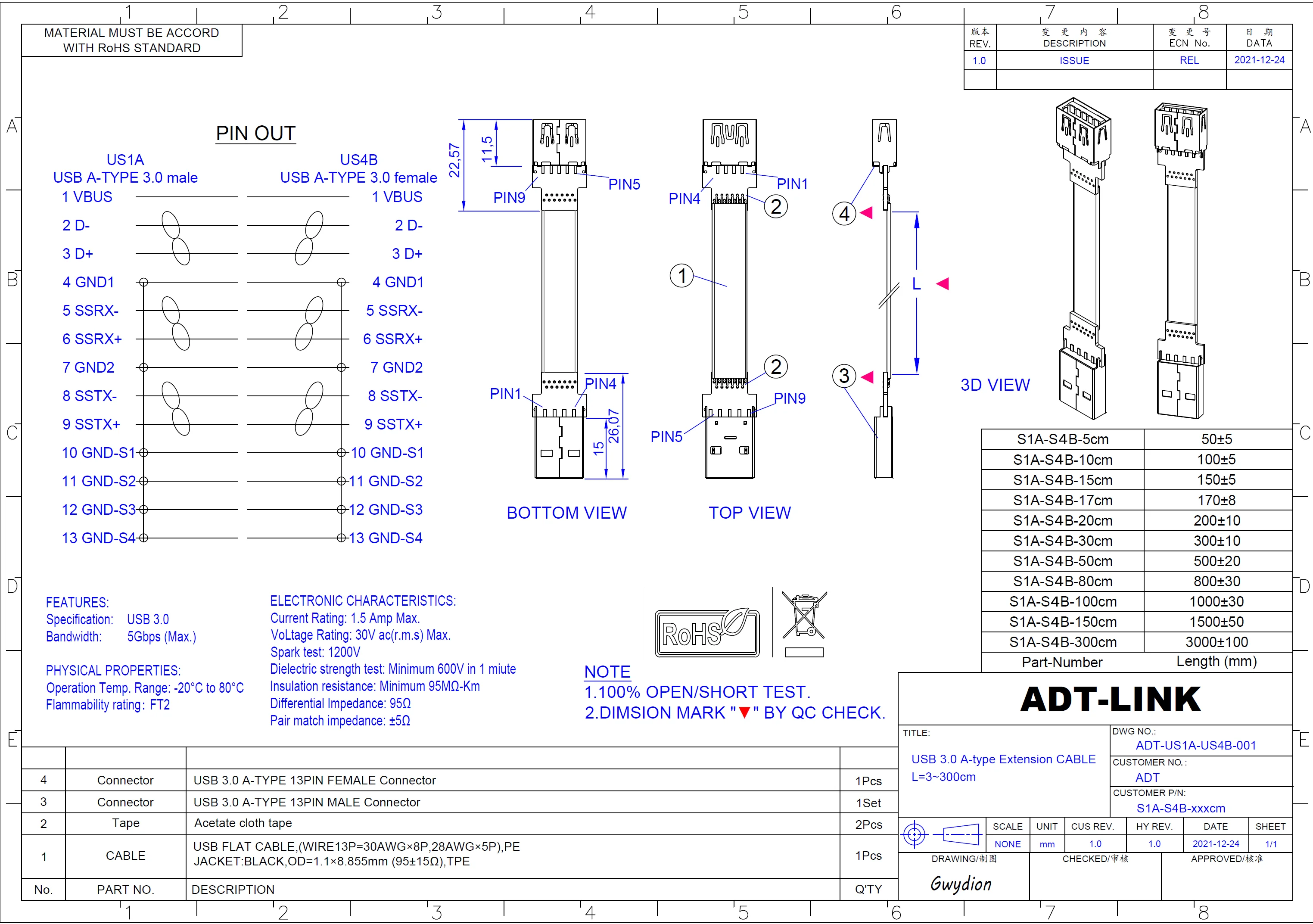 Nombre del producto: cable plano USB 3,0 tipo A macho A tipo A hembra