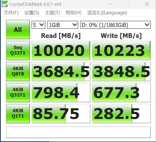 La prueba de laboratorio puede alcanzar la velocidad máxima de PCIe5.0, pero la velocidad completa de PCIe5.0 no está garantizada debido a la influencia de la atenuación de la longitud del cable de extensión, la capacidad de la unidad de la placa base y las condiciones de la señal SSD