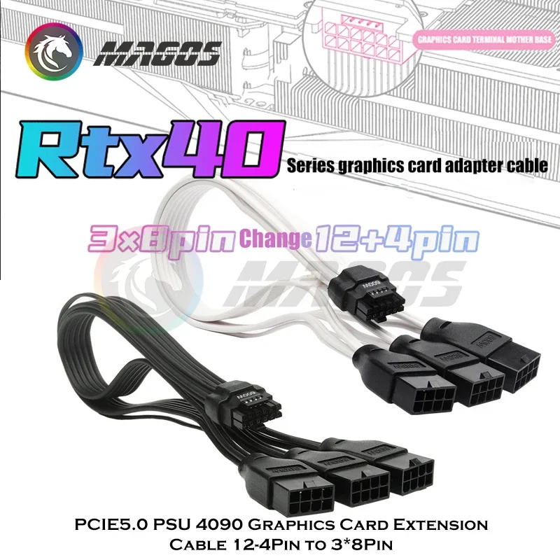 Cable de extensión de tarjeta gráfica PCIE5.0 PSU, 16 pines a 3*8 pines, 600W, 4090, Cable adaptador de módulo GPU, línea de silicona 16AWG, negro/blanco