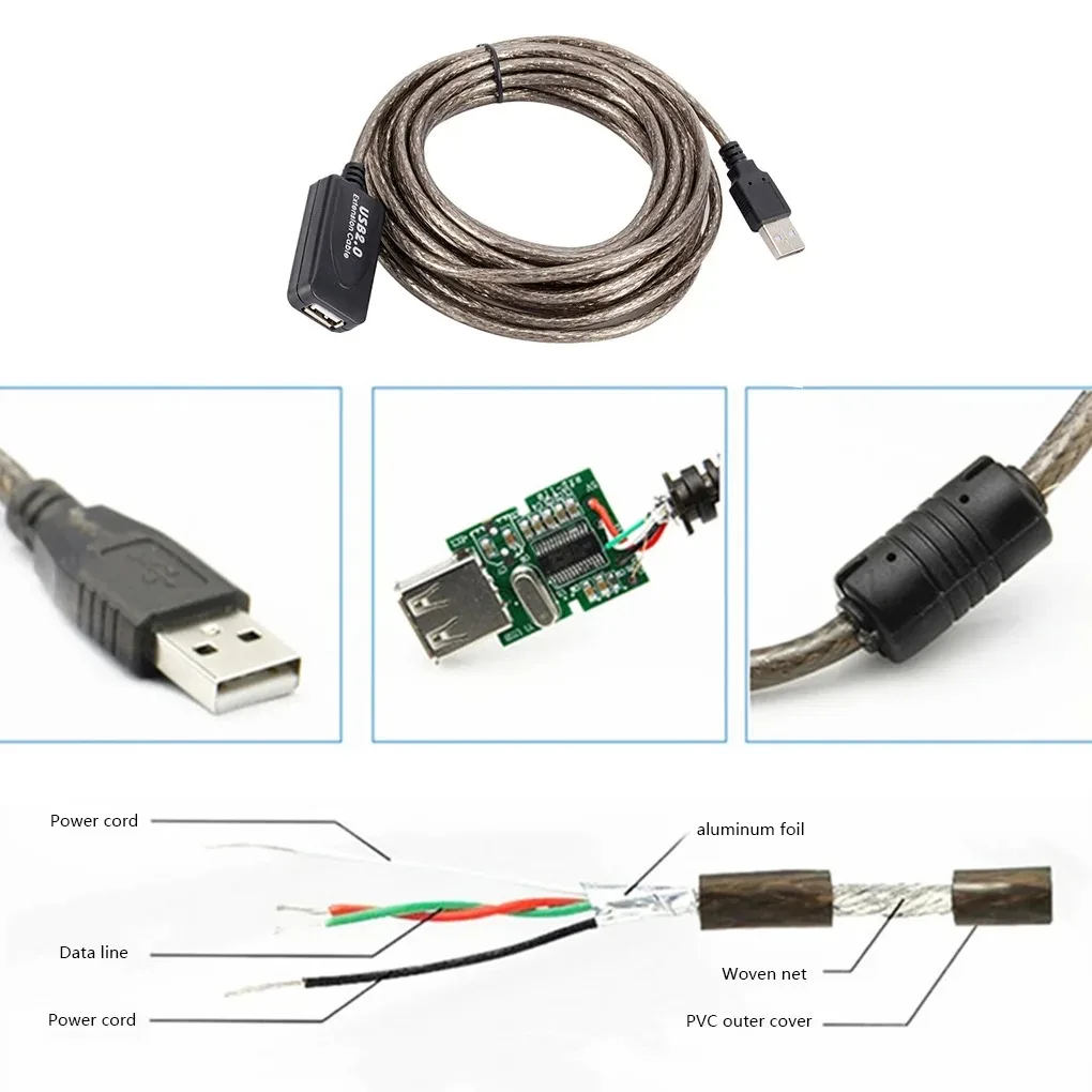 Cable de extensión USB 2,0 de 5M/10M/15M/20M, repetidor activo de alta velocidad, Cable de extensión macho a hembra, adaptador USB para PC y ratón portátil