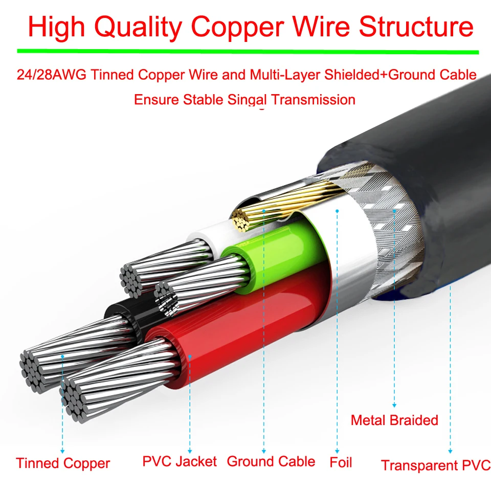 7. La lámina y la trenza blindadas reducen la interferencia EMI/RFI y el núcleo de cobre OFC ayuda a reducir las interferencias, asegurando así una transferencia de datos de alta velocidad y sin errores