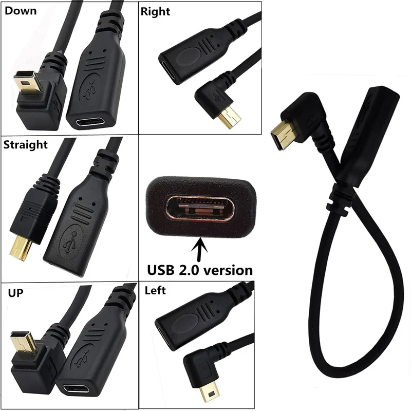 Comprar Cable de extensión USB 2,0 tipo C a 90 grados arriba, abajo, izquierda y derecha, Mini USB macho, USB-C hembra a Mini USB, 0,25 m