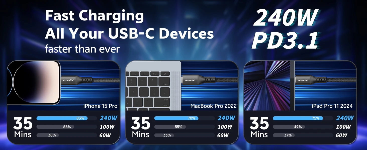 Carga de 240 W y velocidad de 80 Gbps: admite carga rápida y transferencia de datos de velocidad completa (dependiente del dispositivo).