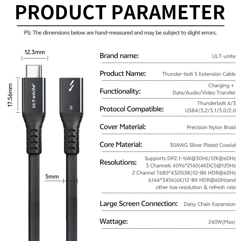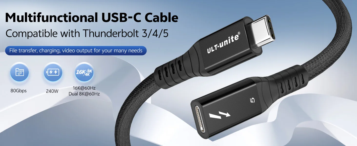 Compatibilidad a prueba de futuro: cable de extensión Thunder-bolt 5 compatible con dispositivos Thunder-bolt 4/3, USB4, USB-C 3.2/3.1.Plug-and-play para Mac, PC, iPad y más.