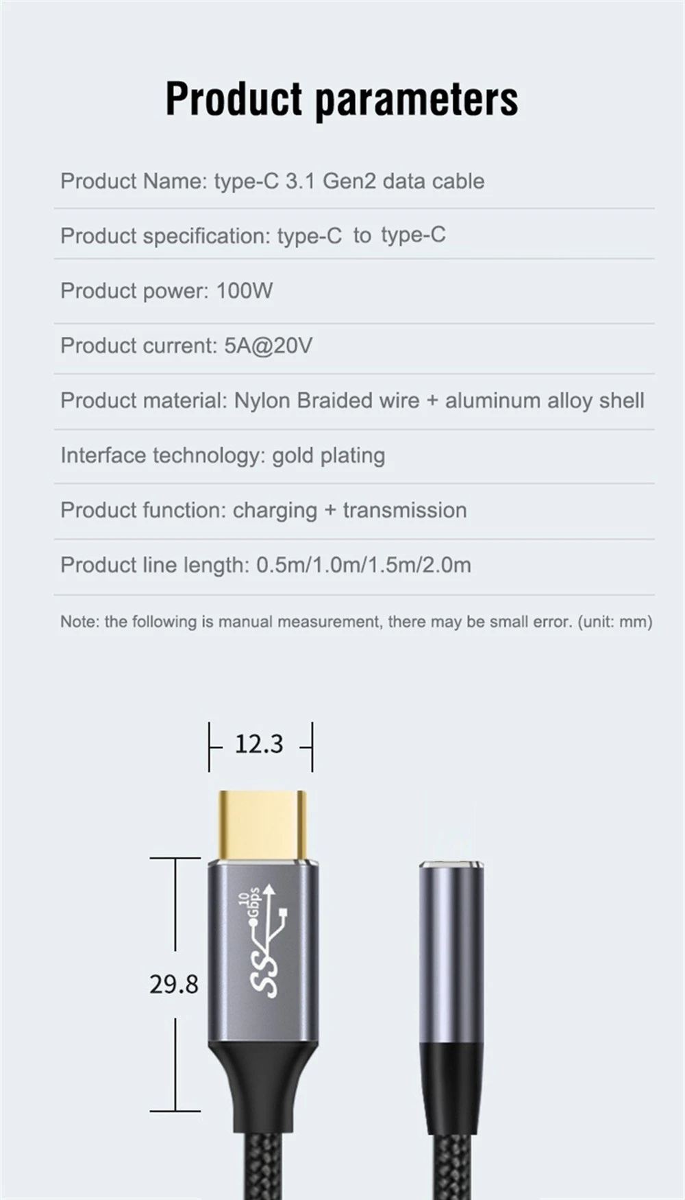 Cable de extensión USB C 3.1 Gen2 de 10 Gbps tipo C a C PD 100W QC4.0 3,0 5A Cable de carga rápida para MacBook Pro 4k Cable de vídeo de 60 Hz