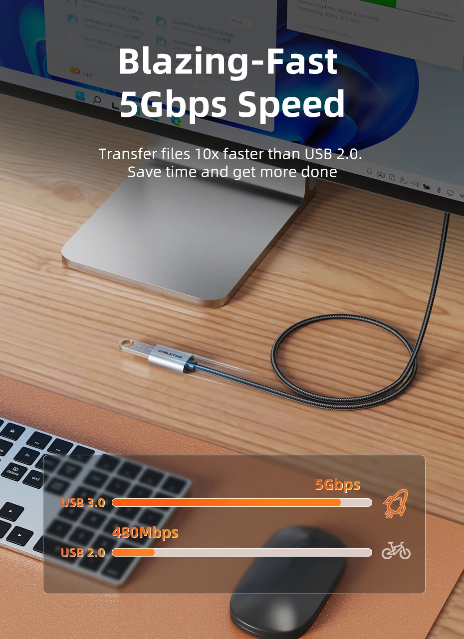 El cable de extensión USB 3.0 transfiere datos a hasta 5 Gbps, diez veces más rápido que el USB 2.0, descargando sus archivos enormes en segundos y permitiendo una carga y sincronización de datos rápidas.Este cable de extensión USB 3.0 macho a hembra también es compatible con dispositivos estándar USB 2.0, 1.1 y 1.0.