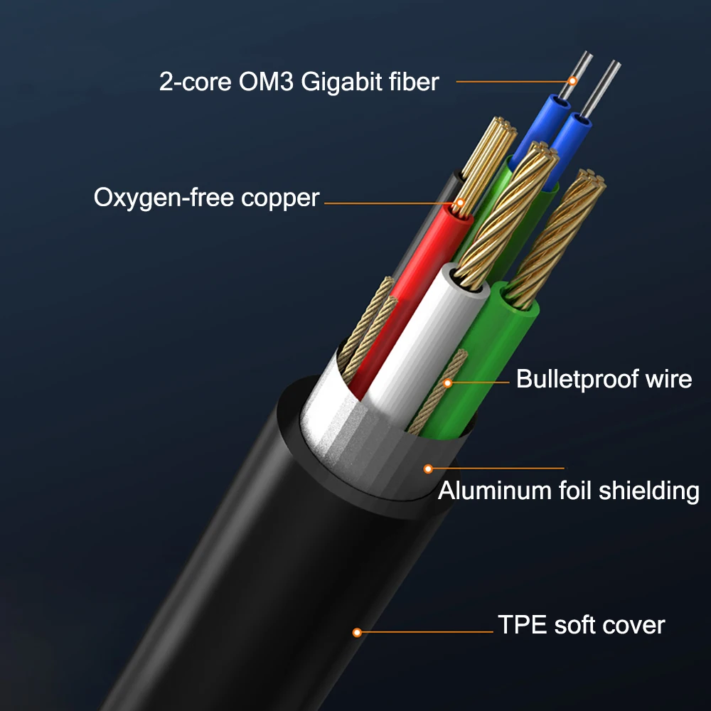 2. Cable de fibra óptica FSU USB 3.2 Gen2 Diseño de construcción de 10 Gbps: fibra óptica multimodo OM3 + cable de cobre, nivel militar de Kevlar en el interior para fortalecer la fuerza de tracción y la flexibilidad.La fibra óptica al motor admite transmisión de señales de larga distancia sin pérdida de señal.