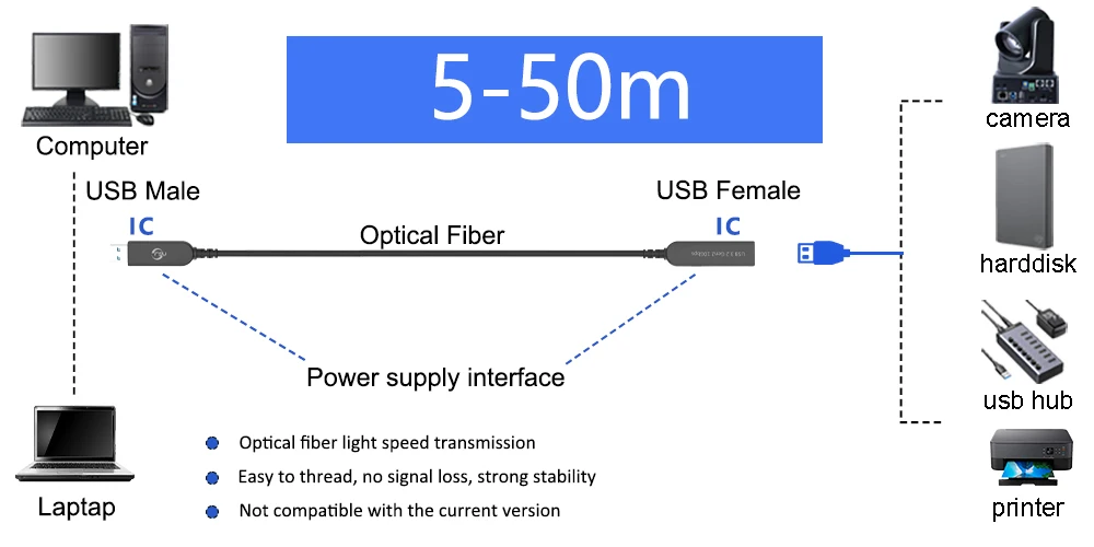 1. Cable activo de fibra de extensión FSU USB 3.2 Gen2 Con la ayuda de un diseño de fibra óptica, cable OD de solo 4,8 mm, fácil de instalar, admite plug & play, sin necesidad de fuente de alimentación externa.Y tiene una interrupción EMI más baja y sin pérdida de señal en transmisión de señal de alta velocidad.Diferentes dispositivos USB con pruebas de compatibilidad integrales antes del envío son perfectamente compatibles con la mayoría de los dispositivos USB.