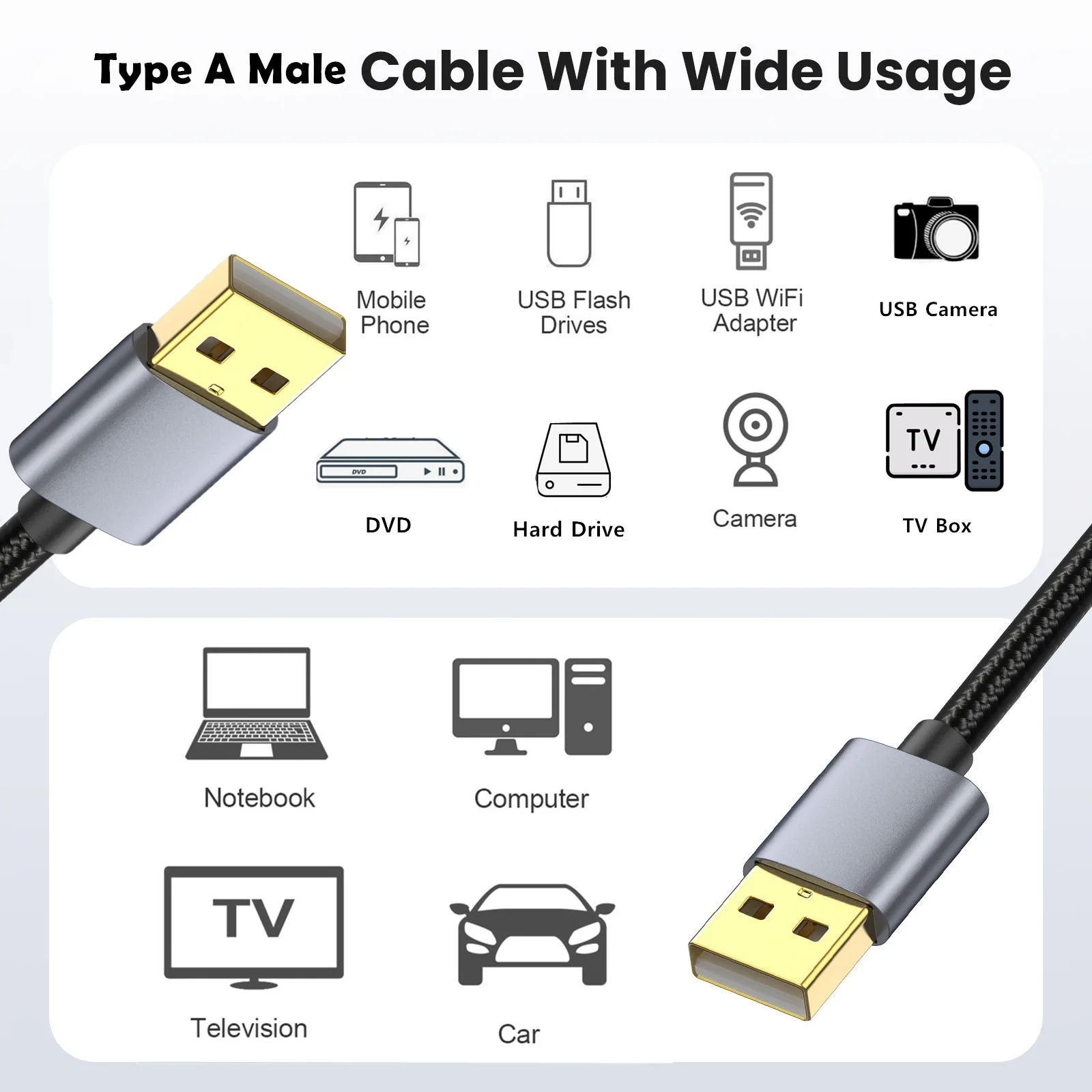 El producto tiene una amplia gama de usos, velocidad rápida, más durabilidad, antiinterferencias, adecuado para varios dispositivos, velocidad teórica de 500 Mb/s, compatibilidad con versiones anteriores con la versión 2.0, el producto es una malla trenzada reforzada, una malla de blindaje multicapa del núcleo del alambre, carcasa del producto: carcasa de aluminio gris titanio, banda ancha de transmisión: 5 Gbps;