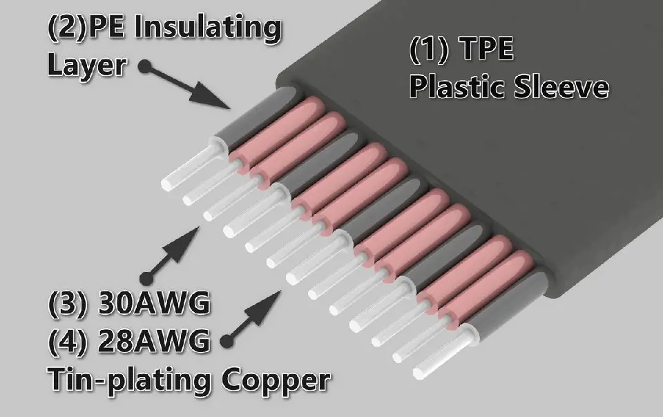 Se utiliza polímero conductor de blindaje EMI, un nuevo material para blindaje EMI y diseño de cable plano. Esta tecnología permite que cada cable esté completamente cubierto por el blindaje EMI del polímero conductor para evitar emisiones entrantes o salientes de frecuencias electromagnéticas, miniaturizar la interferencia y la degradación del rendimiento, y reduce el peso del extensor.