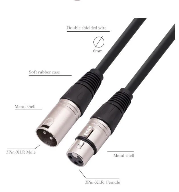 Este cable MIC es perfectamente compatible con piezas de equipos con conectores de 3 pines como micrófonos, mesas de mezclas, amplificadores de potencia, armonizadores de estudio, parlantes, soportes de conexión e iluminación de escenario, etc.Además, estos cables de micrófono XLR se utilizan ampliamente como parlantes de escenario, escenarios de clubes, KTV y cine en casa.