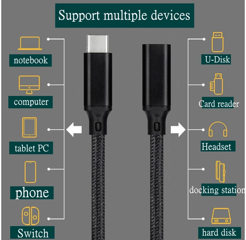 10Gbps Gen2 Tipo-C USB 3,1 Macho a hembra de extensión Datos 100W Cable de carga Cable extensor Diseño reversible 0.3m1m 2M 5mTransferencia de fecha: USB 3,1, (10 Gb/s) 4K 3D