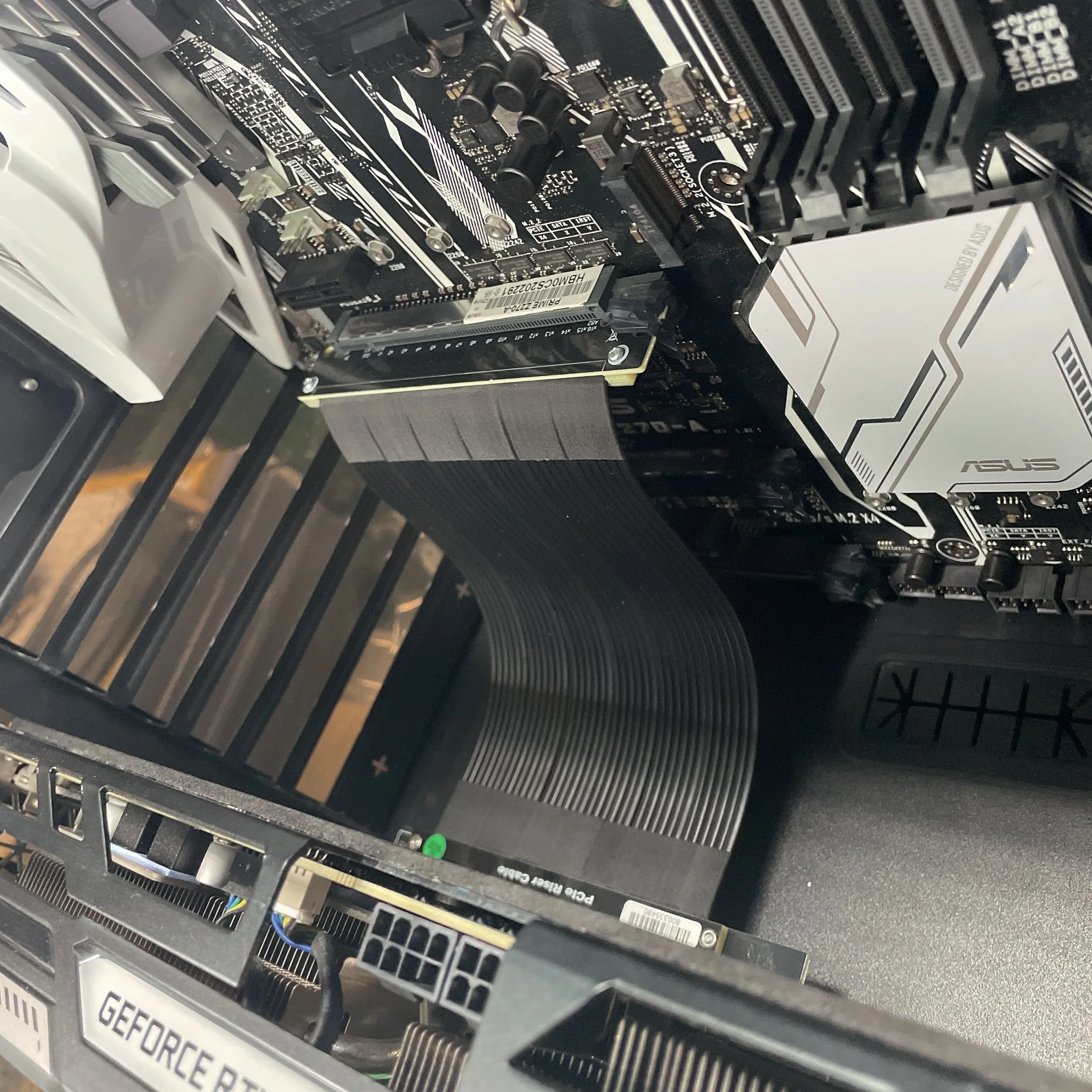 El cable es el cable especial PCIe de cuarta generación desarrollado y diseñado por ADT. El grosor del cable negro es de 1,3mm, el grosor del cable plateado es de 1,4mm y el grosor del cable azul es de 0,85mm. El cable se puede doblar o plegar sin afectar el uso.