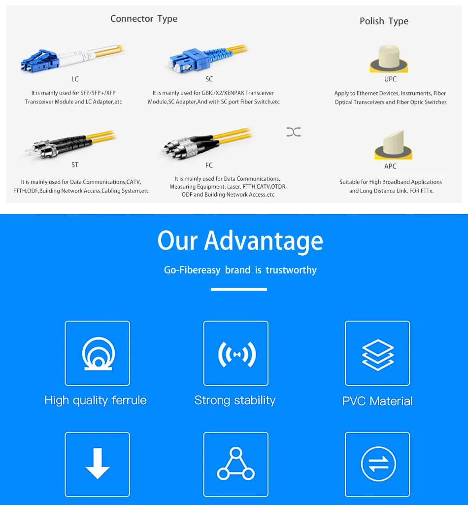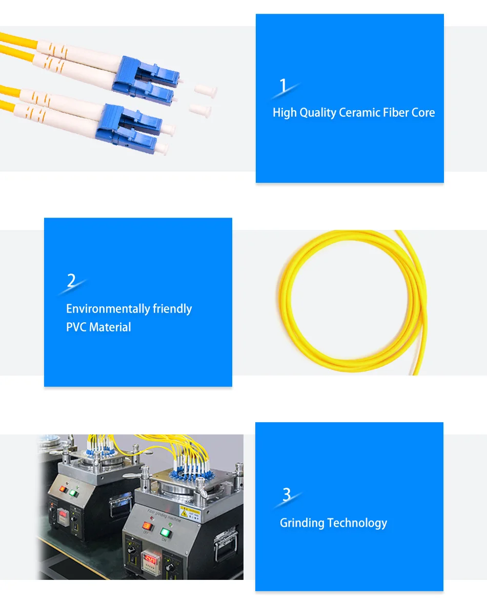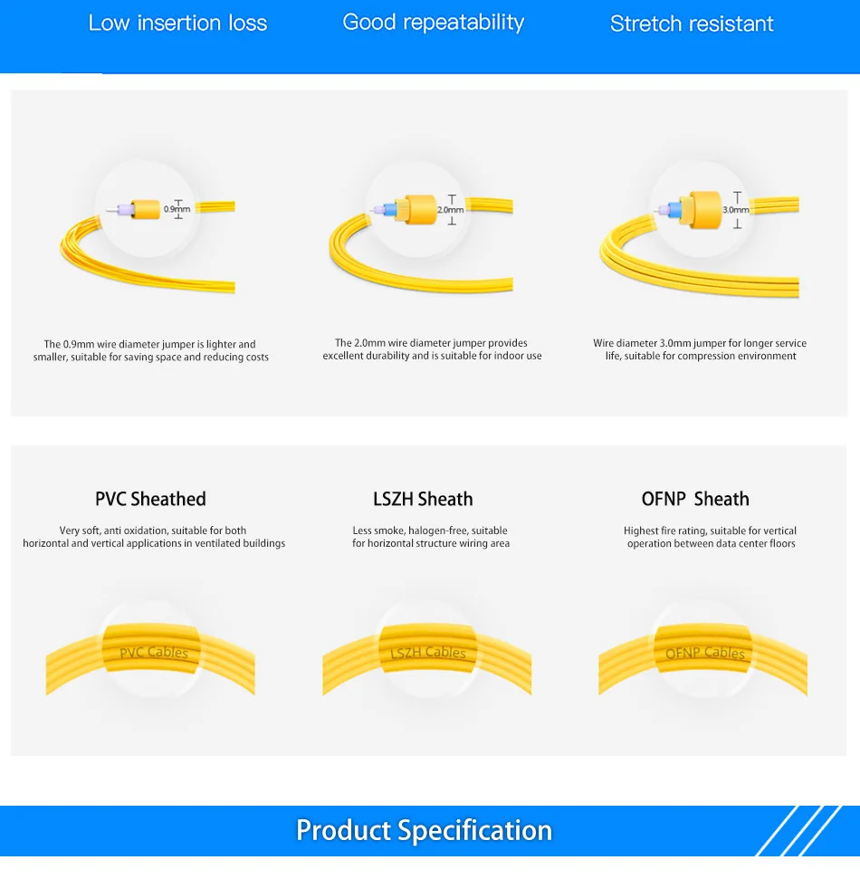 El cable de fibra óptica insensible a la flexión OS2 monomodo de 9/125 μm tiene menos atenuación cuando se dobla o tuerce en comparación con los cables de fibra óptica tradicionales y esto hará que la instalación y el mantenimiento de los cables de fibra óptica sea más eficiente... También puede ahorrar más espacio para su cableado de alta densidad en centros de datos, redes empresariales, salas de telecomunicaciones, granjas de servidores, redes de almacenamiento en la nube y cualquier lugar donde se necesiten cables de conexión de fibra.