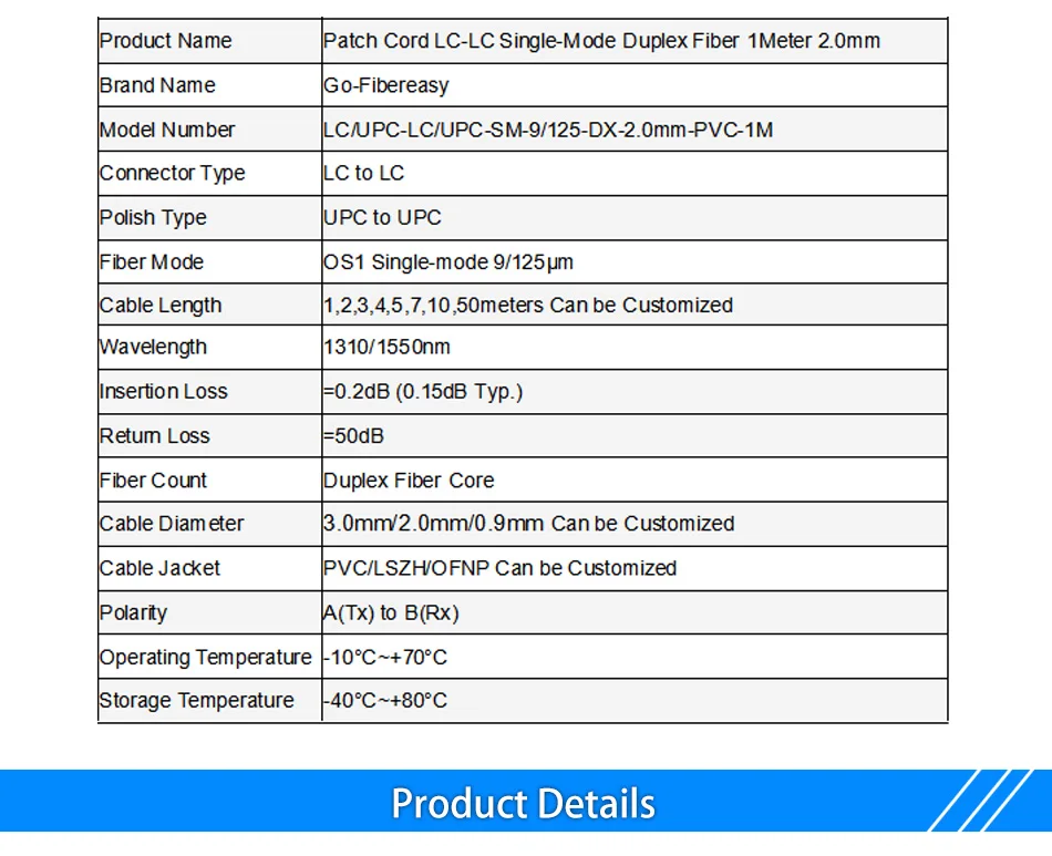 Este cable de fibra óptica de modo único 9/125 OS2 es ideal para conectar conexiones Ethernet de 1G/10G/40G/100G/400G. Puede transportar datos hasta 10km a 1310nm, o hasta 40km a 1550nm.