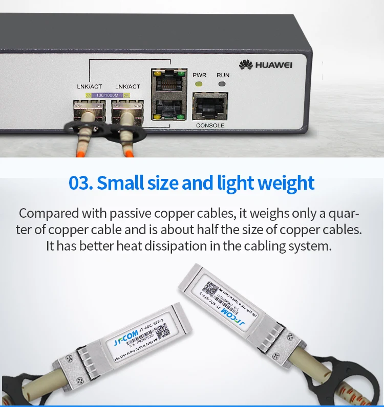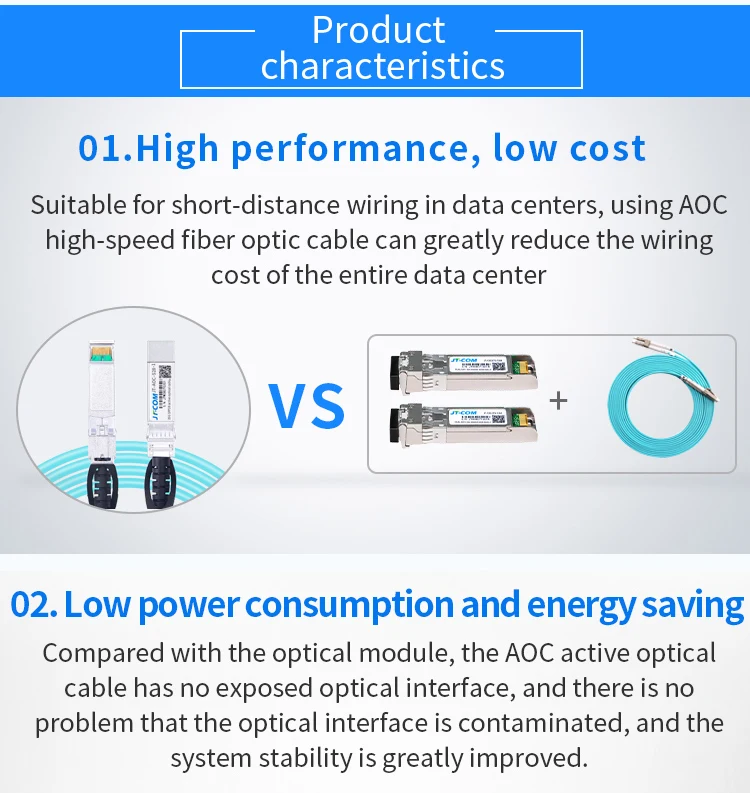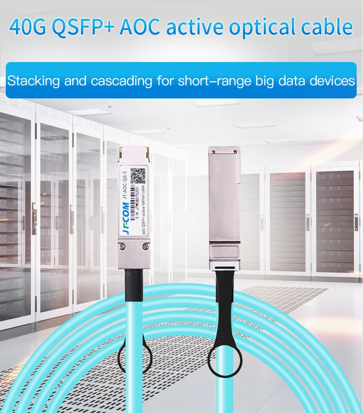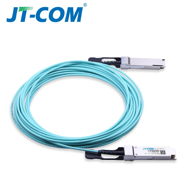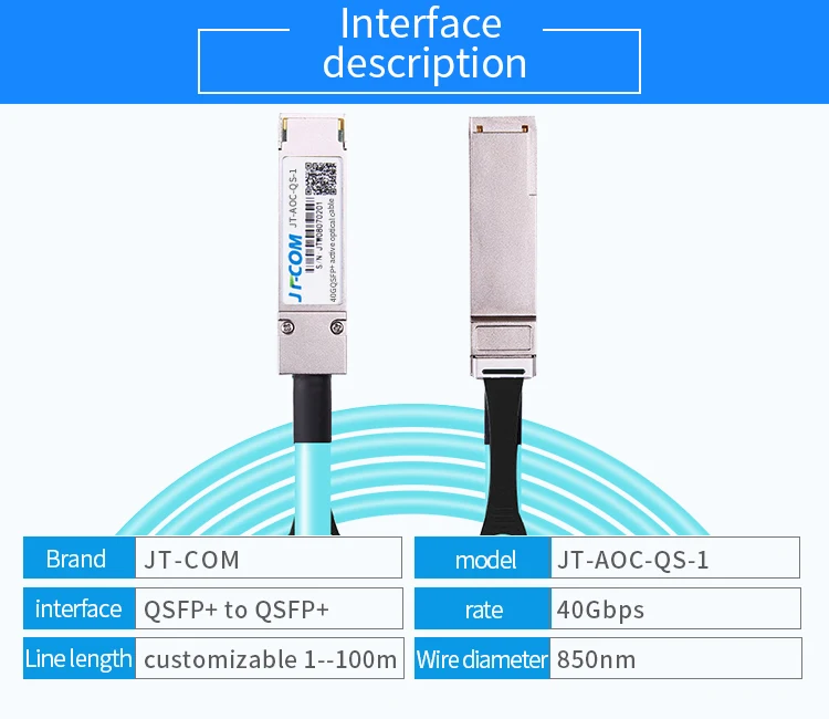 La familia de JT-COM de JT-AOC-QS son QSFP + los Cables ópticos activos (AOCs) son cables ópticos activos de la interfaz QSFP +. El módulo tiene un dispositivo de conversión fotoeléctrica en el interior para convertir las señales eléctricas en señales ópticas y transmitir distancias de hasta 100 metros. Los productos tienen cuatro canales, tasa de transmisión de cada canal de hasta 10 Gb/s, tasa de 40 Gb/s. Su bajo consumo de energía, tasa de error de bits bajos, fácil de administrar, las características de alto rendimiento son ampliamente utilizadas en conexión de alta velocidad a corta distancia, como 10 Gigabit Ethernet, 10 interruptores Gigabit,. 10 servidores Gigabit, superordenadores, cloud computing y redes de almacenamiento en la nube.Características del productoVelocidad de transmisión de datos de hasta 10,3 Gbit/s por canal