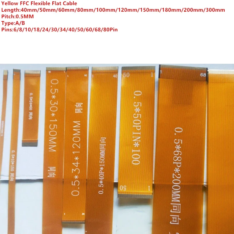 Cable Flexible plano amarillo FFC FPC, paso de 0,5mm, línea de pantalla LCD 6P/8P/10P/18P/24P/30P/34P/40P/50P/60P/68P/80Pin