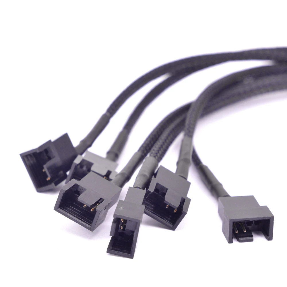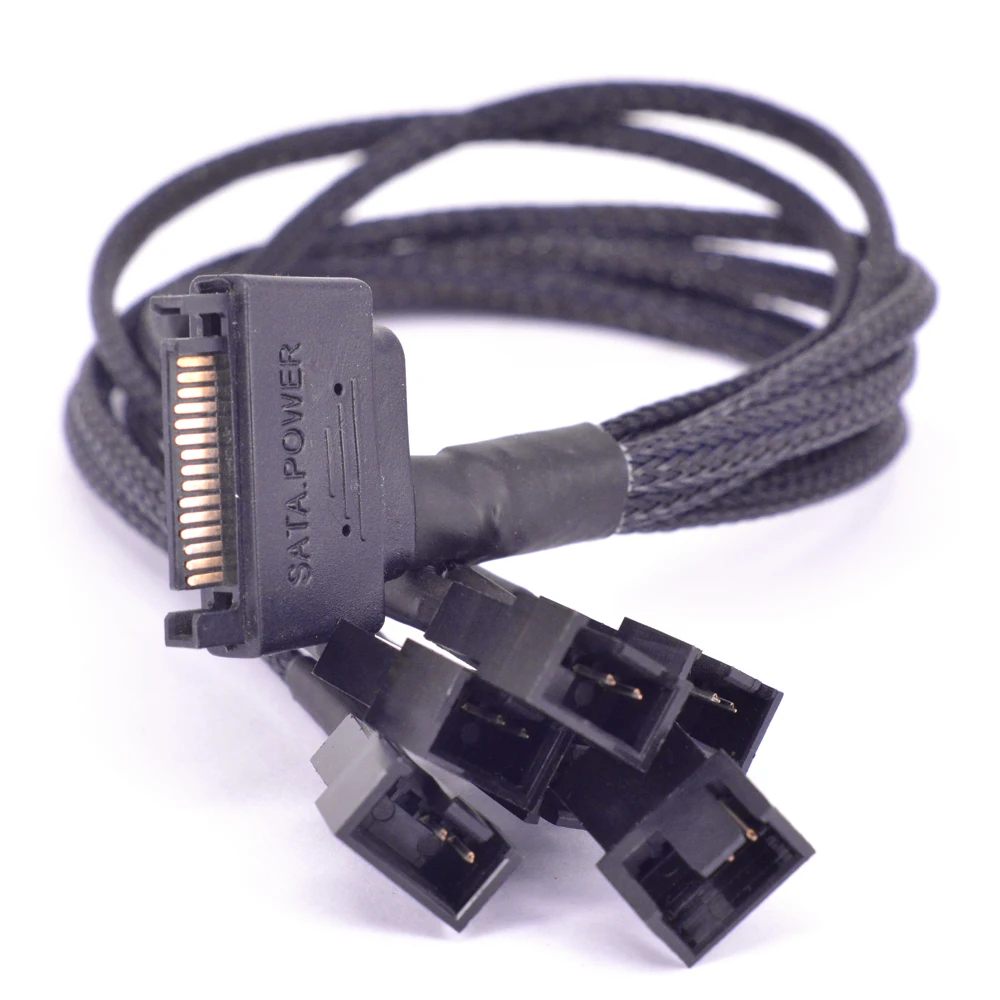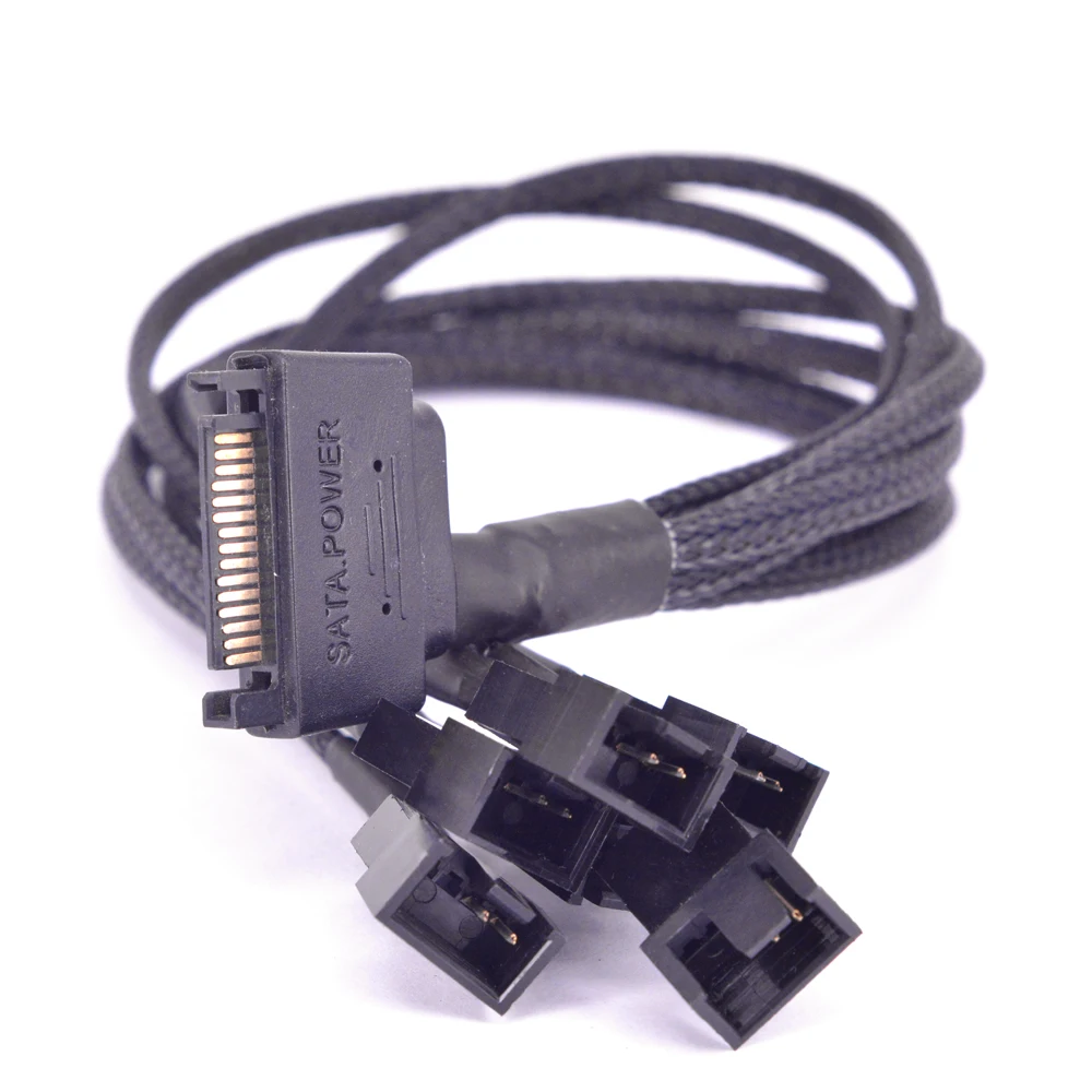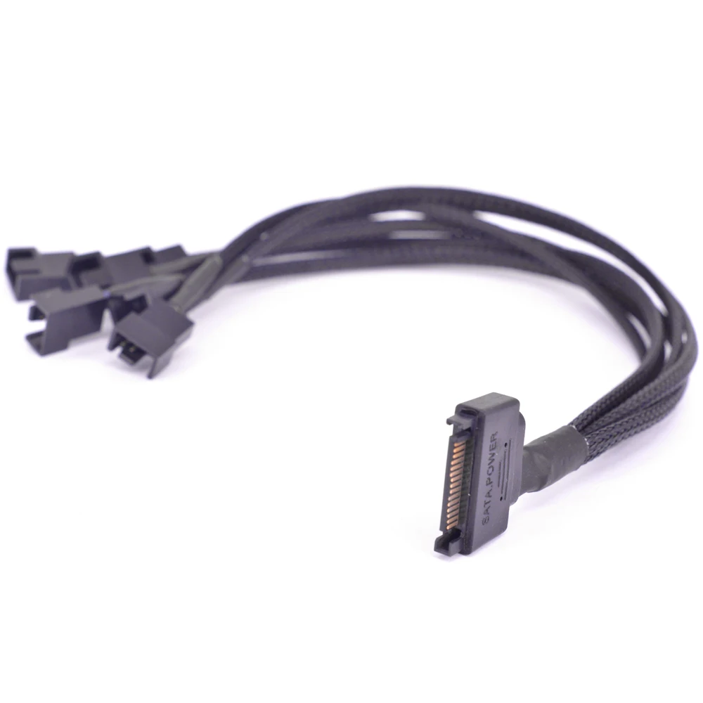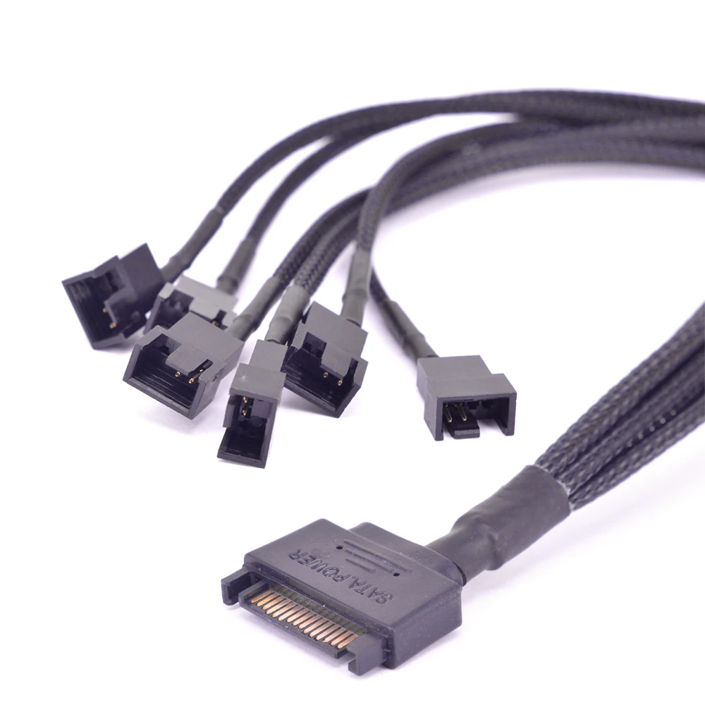15Pin SATA Power a 6 puertos 3Pin Fan Cable de alimentaciónMaterial: conector ambiental negro,Tejido ultra denso trenzadoCable 22AWGVoltaje de salida: 12VLongitud: 30cm