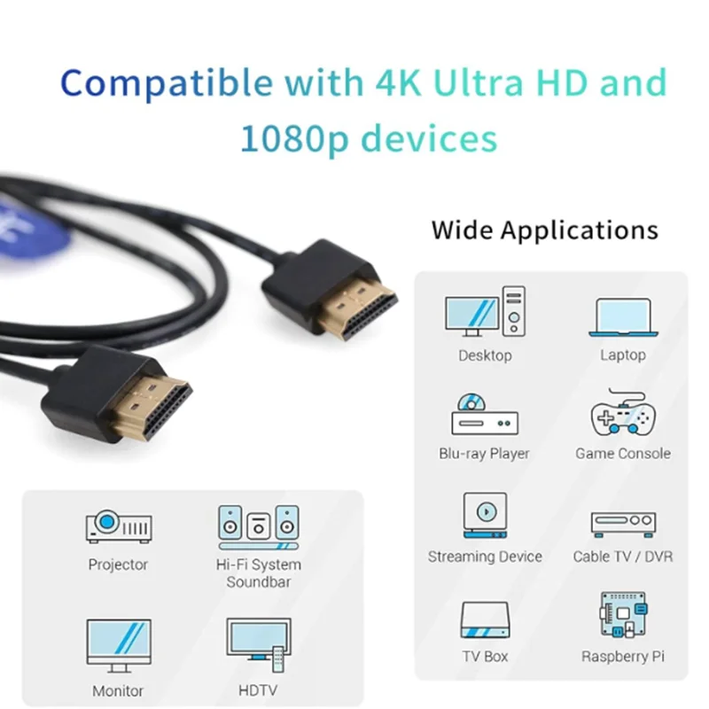 - Cable HD de alta velocidad: el cable HD Hyper Slim admite 4K/UHD@60Hz a 18 Gbps, HDTV 2.0a/b y 1,4a.Esto significa que puede transmitir vídeo en 4K 2160p (UHD), 1440p (QHD) y 1080p (HD) sin limitaciones.