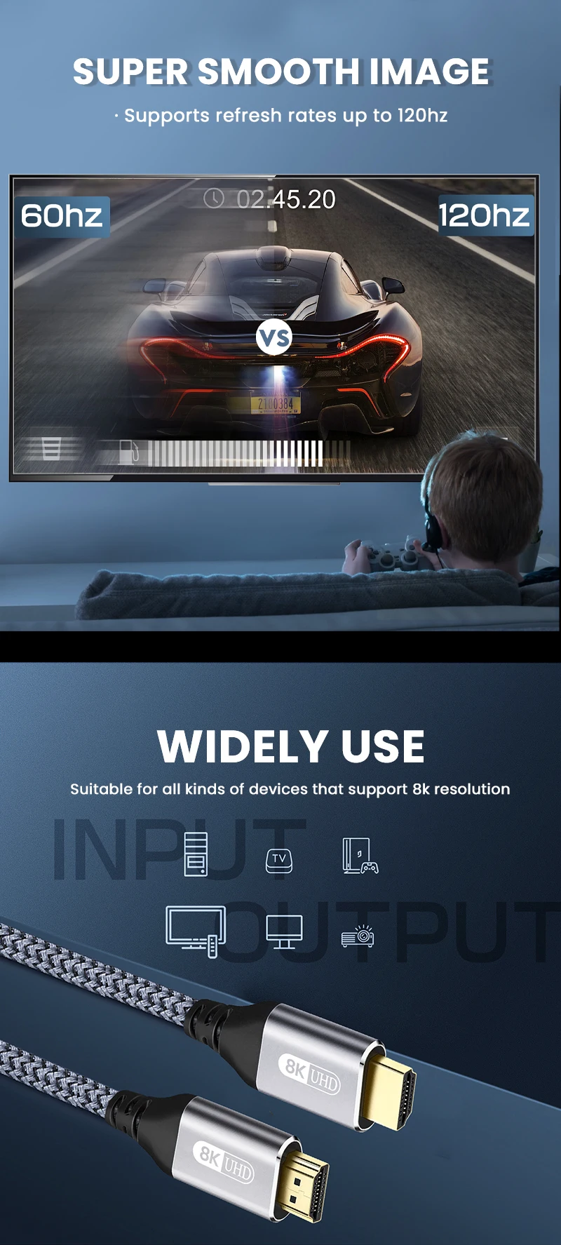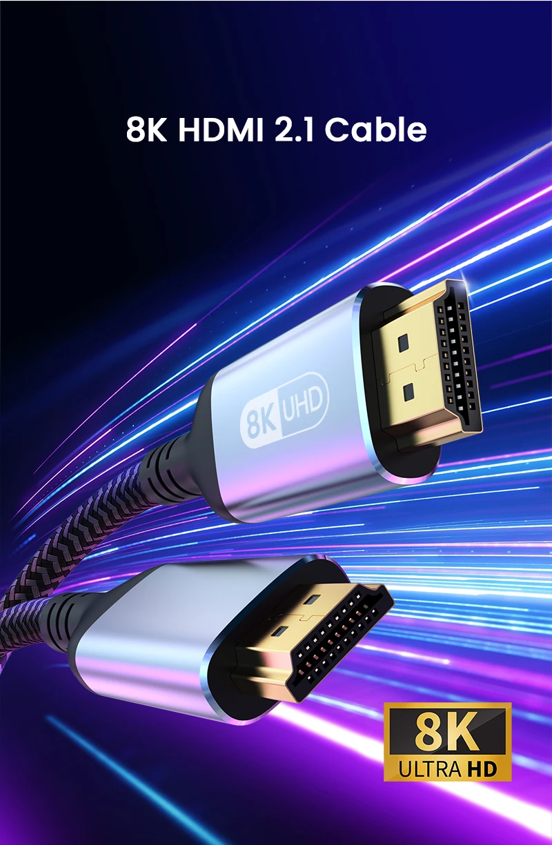 2. Compatibilidad total:CV0015 HDMI 2,1 Cable macho a macho Compatible con vídeo 8K @ 60Hz, compatible con versiones anteriores de 4K @ 120Hz, 4K @ 144Hz, 4K @ 75Hz, 4K @ 60Hz, 5K @ 60Hz, 5K @ 30Hz, 4K @ 30Hz, 1440p(2K) @ 240Hz (4:2:0), 1440p(2K) @ 144Hz, 1440p(2K) @ 120Hz, 1440p(2K) @ 75Hz, 1440p(2K) @ 60Hz, 1440p(2K) @ 30Hz, 1080p @ 240Hz, 1080p @ 144Hz, 1080p @ 120Hz, 1080p @ 60Hz, 1080p @ 30Hz, 720p a 120Hz y 720p a 60Hz. Versiones anteriores de cable HDMI (2.0b/2.0a/2,0/1,4/1,3).
