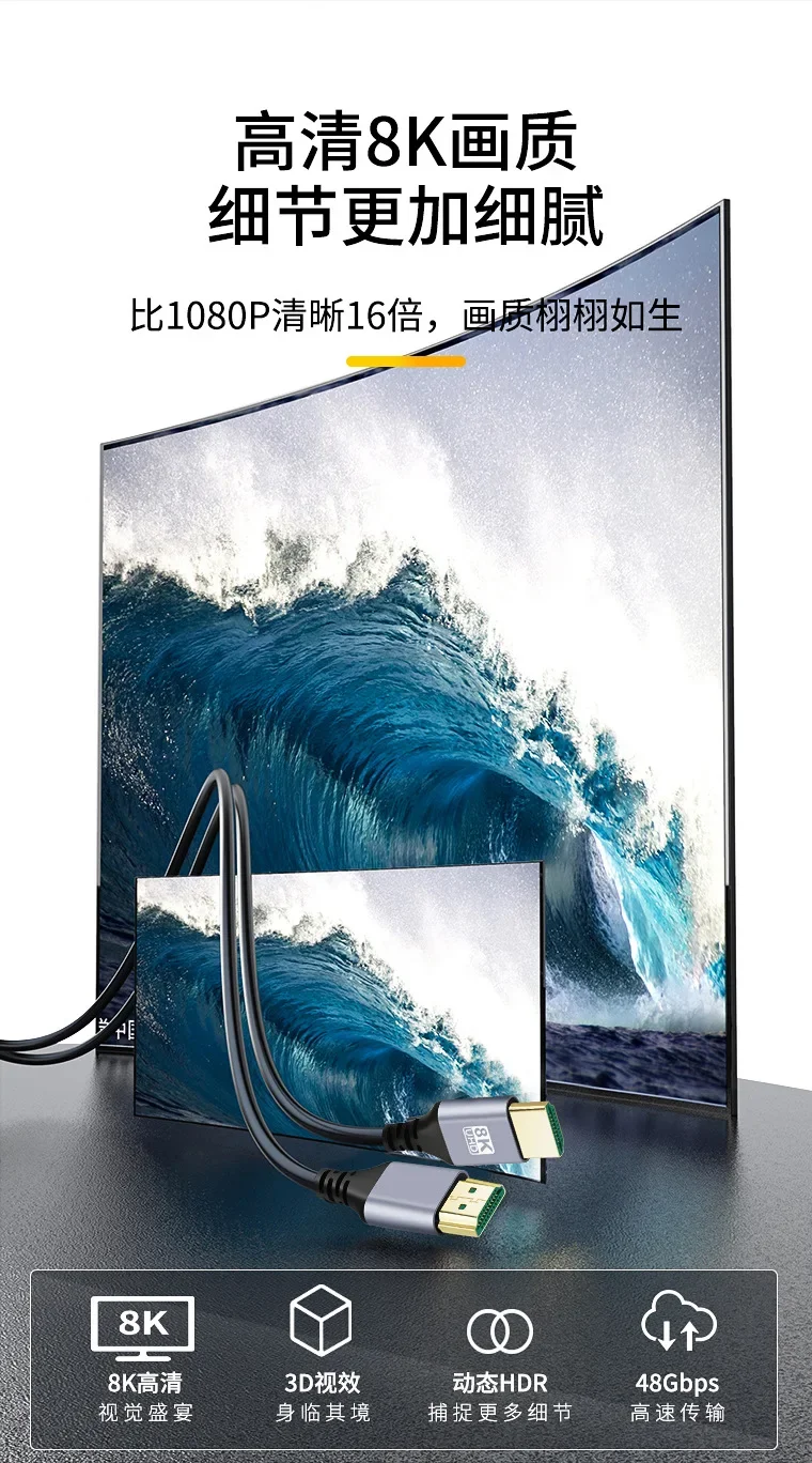 2.Ancho de banda estándar de 48 Gbs para vídeo ilimitado de 8K (UHD), 1440p (QHD) y 1080p (HD).Disfrute de una calidad de vídeo inigualable, un sonido claro y preciso y una conexión Ethernet sin búfer.