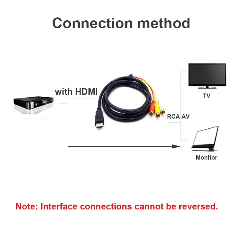 Cable compatible con HDMI a 3RCA 1,5 M con HDMI 1,4 V a cable AV Monitor HDTV Cable de audio y video para decodificadorAviso al comprador antes del pedido1. El cable no es compatible con PC/ordenador portátil/para PS4/para XBOX/DVD2. Este cable solo es compatible con dispositivos de señal digital HDMI y dispositivos de señal analógica RCA.Con HDMI es señal digital, RCA es señal analógica, el cable no admite señal de conversión, sino solo Transferencia de señal.El cable no puede convertir la señal digital en señal analógica, tampoco puede convertir la señal analógica en señal digital.Asegúrese de que el dispositivo que desea conectar tiene la función de codificación y decodificación al mismo tiempo.3. Entrada unidireccional compatible con HDMI a 3 salidas RCA4. Asegúrese de que ambos dispositivos de entrada y salida estén apagados cuando enchufe y desenchufe este cable.Especificación:Tipo: Transmisor de señalLongitud del cable: Aprox. 1,5 M/5 piesEntrada: macho compatible con HDMIConectores macho 3RCA: rojo, blanco, amarilloCaracterísticas:-Operación simple, plug and play-Ligero y práctico, portátil-Soporta todas las versiones con HDMI 1,0-1,3.-Soporta resolución 480i / 480p / 720p / 1080i / 1080p-Ideal para conectar reproductor HD A LA TV-Conectores chapados en oro de 24K para una mejor transferencia de señal