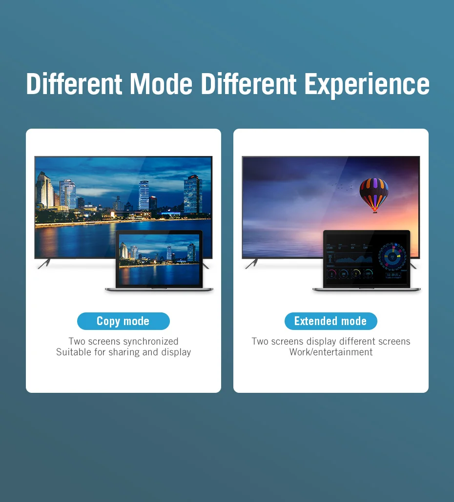 Copy mode: Two screens synchronized. Suitable for sharing and display.