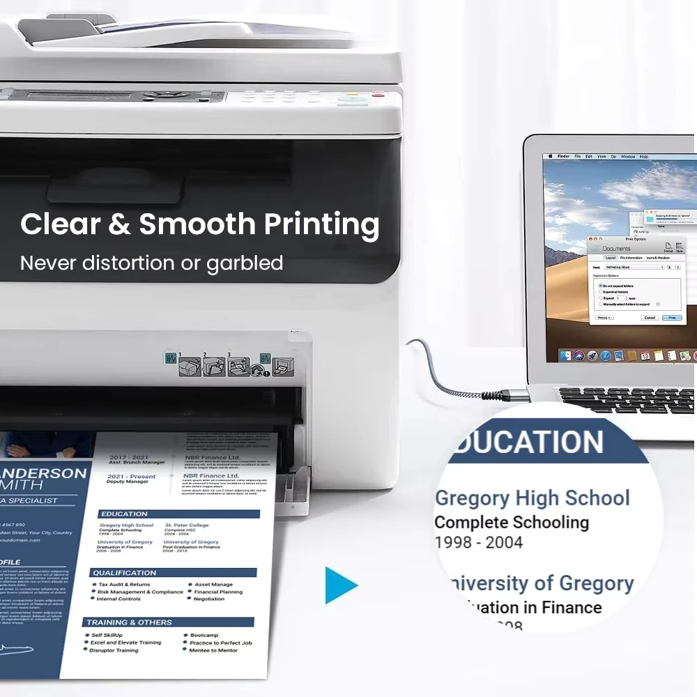 【Stable Connection and Durable Design】: The cable features a nylon braided sheath that provides excellent transmission performance and shields against EMI/RFI noise. The fully shielded PVC cable allows for clear and convenient printing without any data loss during the printing process.
