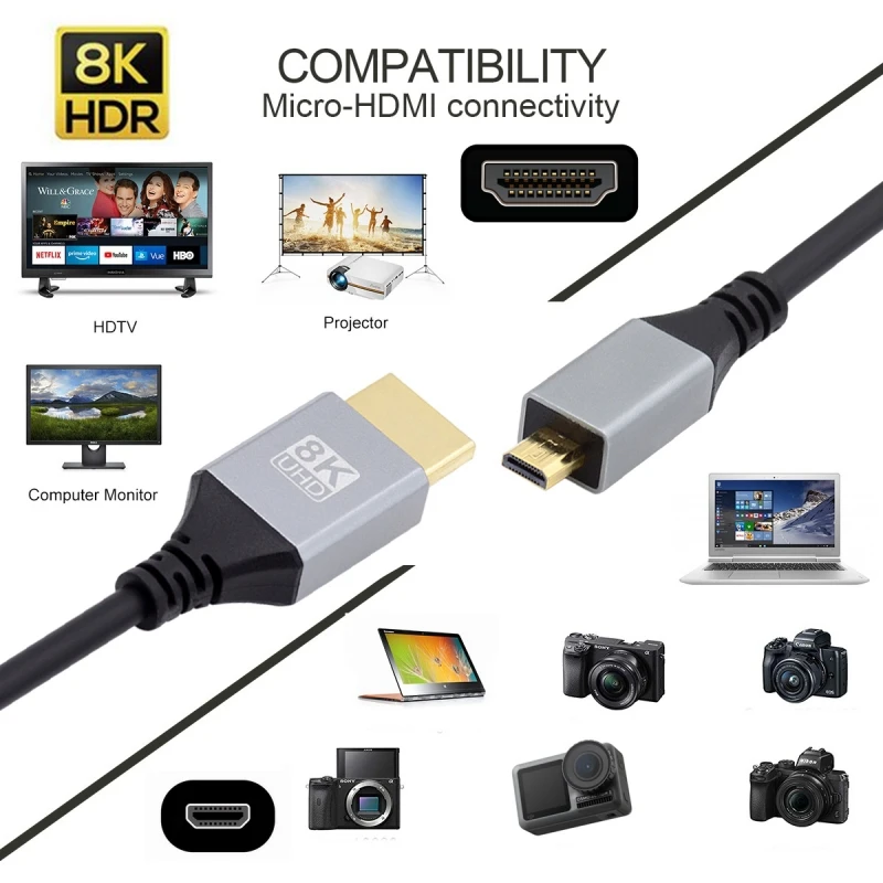 Comprar Cable Micro HDMI a HDMI compatible con cámara GoPro Hero 7, 6, 5, Sony, A6000, Nikon, Canon, 2,1, 3D, 8k, 1080P, alta velocidad
