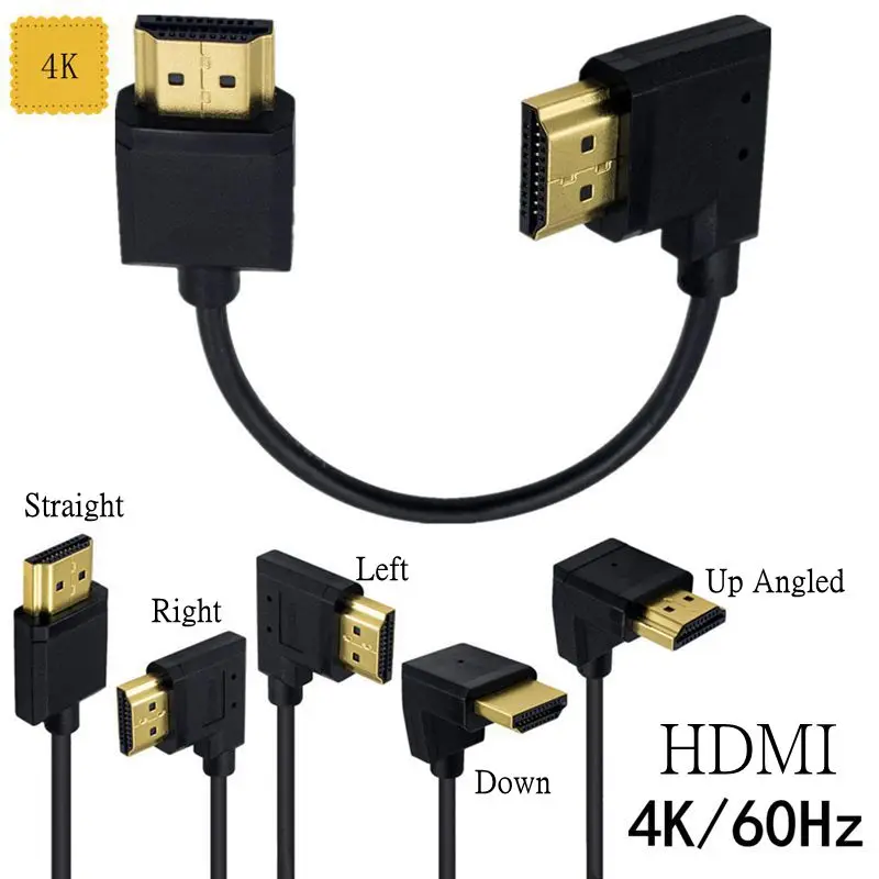 OD3.2mm Super Extreme Slim Cable compatible con HDMI de alta velocidad Mini Micro compatible con HDMI 2,0 Arriba Abajo Izquierda Derecha En ángulo 90 grados macho Cable corto Delgado 4K * 2K @ 60HZ 3840*2610, 4K, UltraHD, 3D, Ethernet y canal de Retorno de Audio 0,15 m
