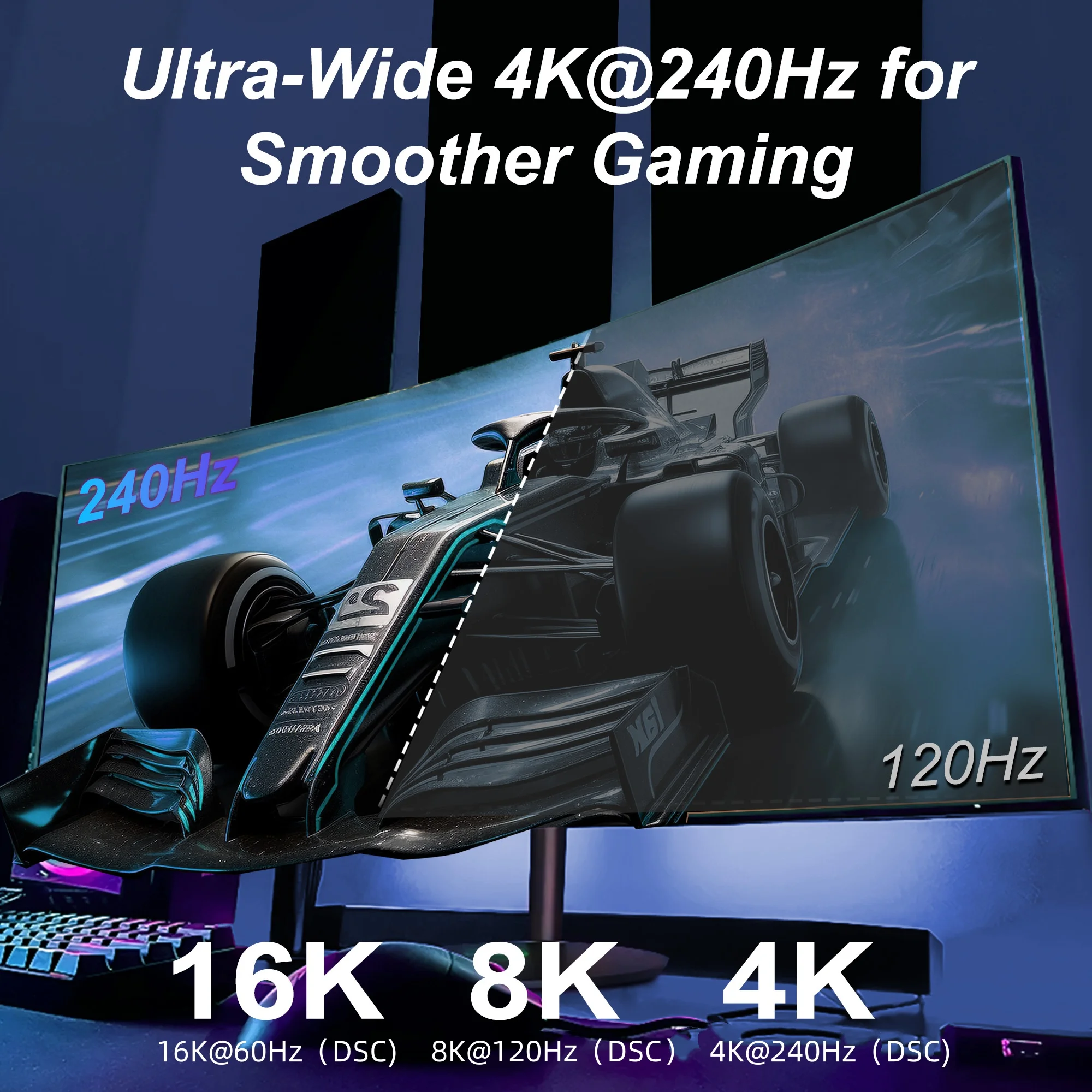 Resolución ultraalta Admite 16K (7680x4320 a 60 Hz), conexiones de alta velocidad de bits 3: ancho de banda total de hasta 56 Gbit/s y velocidad de datos de video de 32,4 Gbit/s.