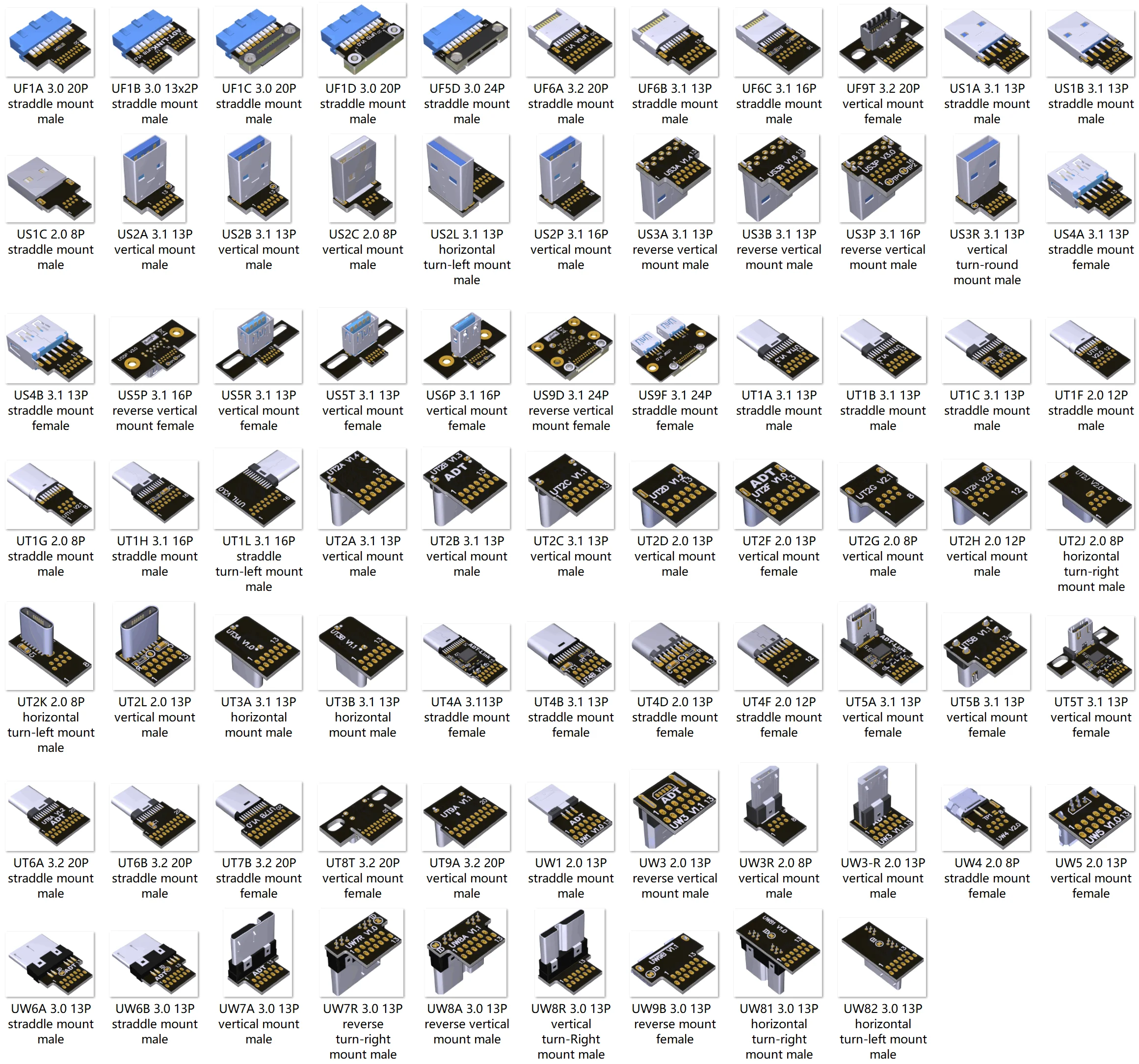 S=USB-A; C=USB-C; W=USB-B; F=USB-E