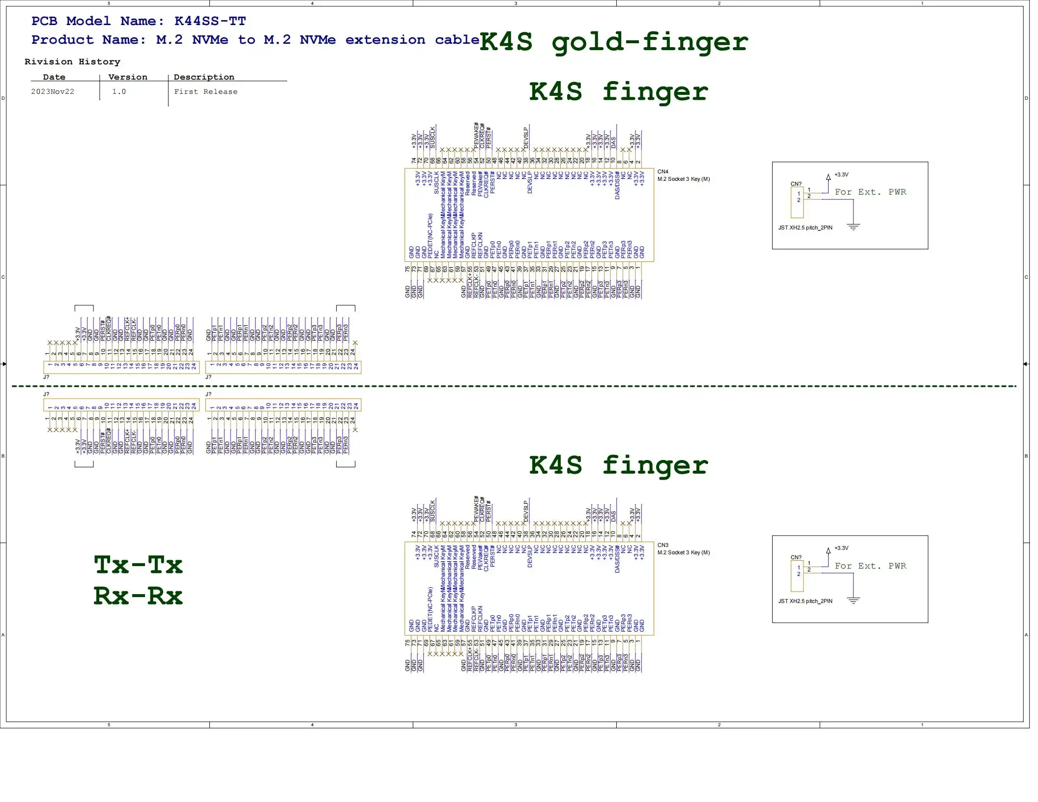 ModelosDirección de interfaz Goldfinger y conectorSeñal Tx-RxK44SS-TTM.2 NVMe Gold-Finger a M.2 NVMe Gold-FingerSeñal directaK44SS-TRDedo Dorado a M.2 NVMe Dedo DoradoSeñal de intercambioVentajas del producto: