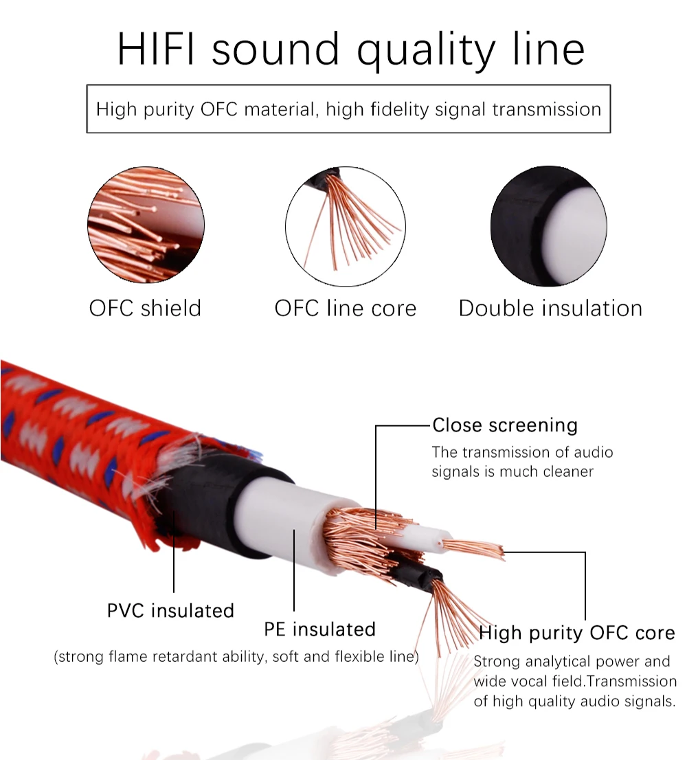 Cable OFC de alta pureza, hace que la música de fondo sea más silenciosa, sonido limpio, frecuencia media gruesa, flexibilidad de baja frecuencia, campo de sonido amplio, fuerza analítica fuerte, calidad de sonido HIFI.