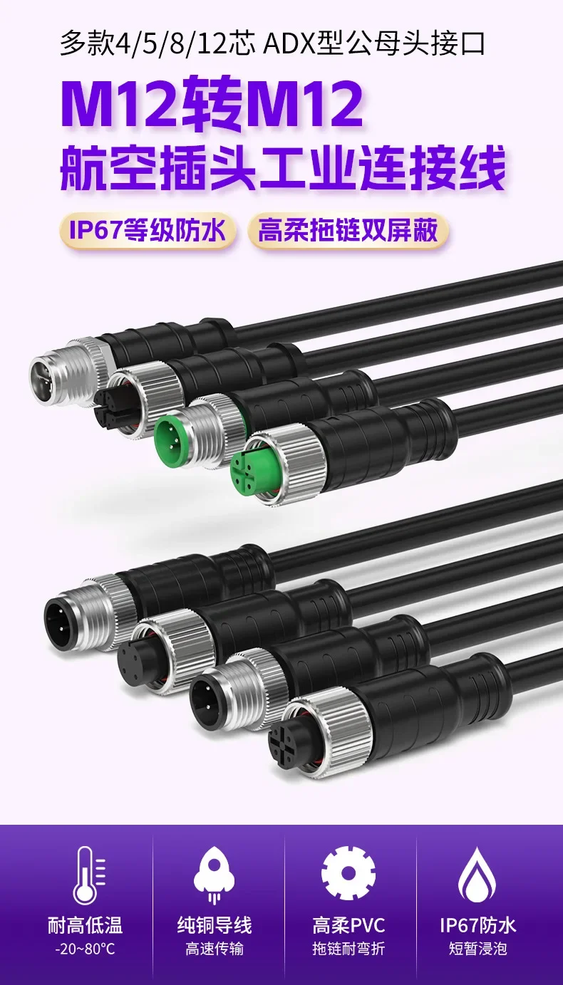 M12 4Pin 8Pin 12Pin Connector Cable Waterproof A/D/X Code Male to Female Extension Line Shielded Gigabit Network Connection Cord