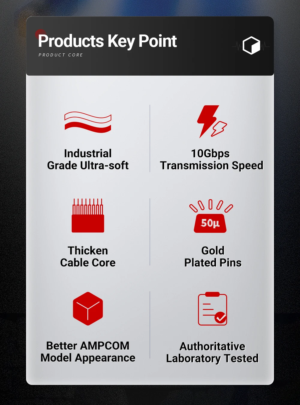 Industrial/Velocidad de transmisión de 100-1000 Mbps/Núcleo de cable grueso/Pasadores chapados en oro/Mejor apariencia del modelo AMPCOM/Prueba en laboratorio autorizada.