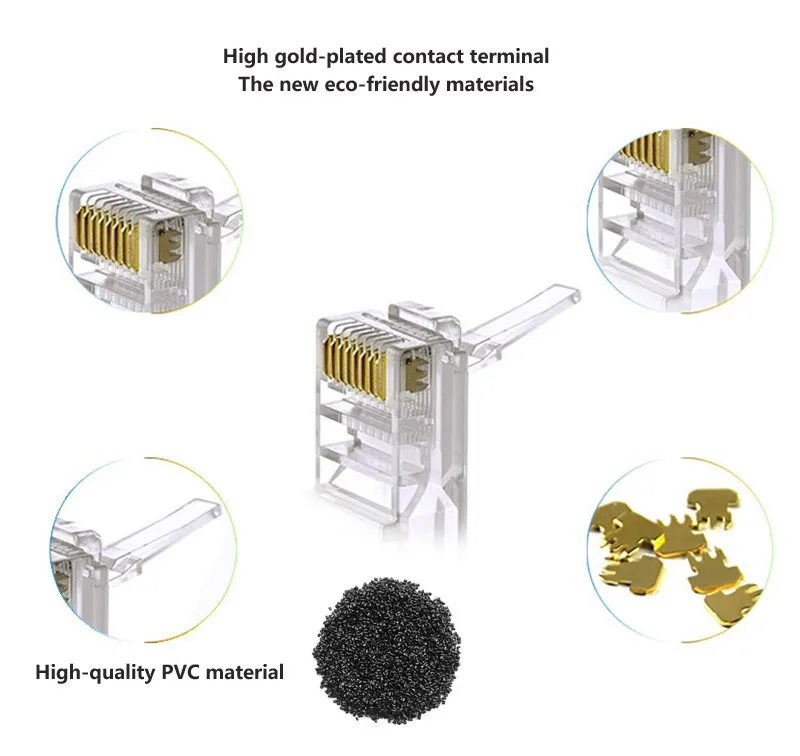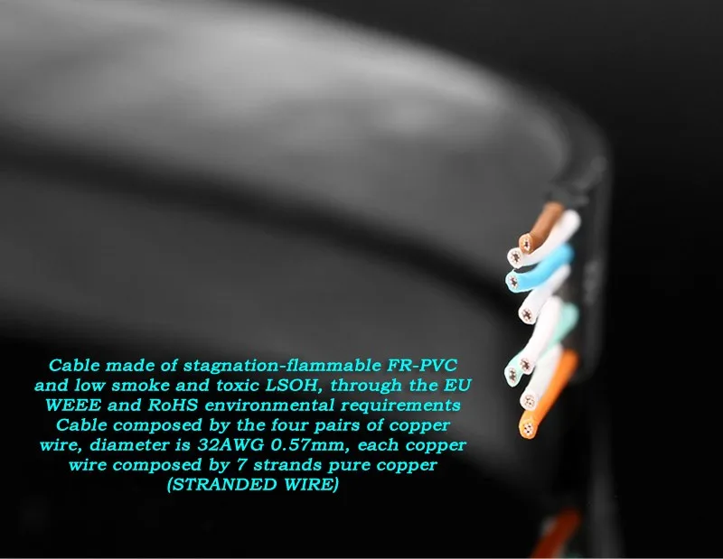 1. cable hecho de estancamiento-inflamables fr-pvc y bajo humo y tóxico LSOH, A través de los requisitos ambientales de la UE2. cable compuesto por los cuatro pares de alambre de cobre, diámetro es 32awg 0.57mm, cada alambre de cobre de la composición Chiku puro cobre (alambre trenzado)3. la tasa de transferencia de hasta 1000 Mbps (Gigabit Ethernet, el ancho de banda de transmisión de hasta 250 MHz4. El alambre-Acabado bien acabado, fácil almacenamiento y portabilidad.Ancho de banda de transmisión de hasta 250 MHz, la velocidad de transmisión de hasta 1000 Mbps