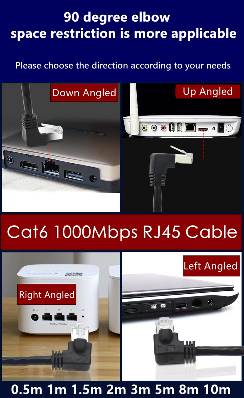 Comprar Cable RJ45 de 10m, 8m, 5m, 3m, 1m, 26AWG, CAT6, UTP, ángulo lateral, forma de L, Cable de conexión RJ45, Cable Ethernet, Cable Lan, codo Gigabit CAT6