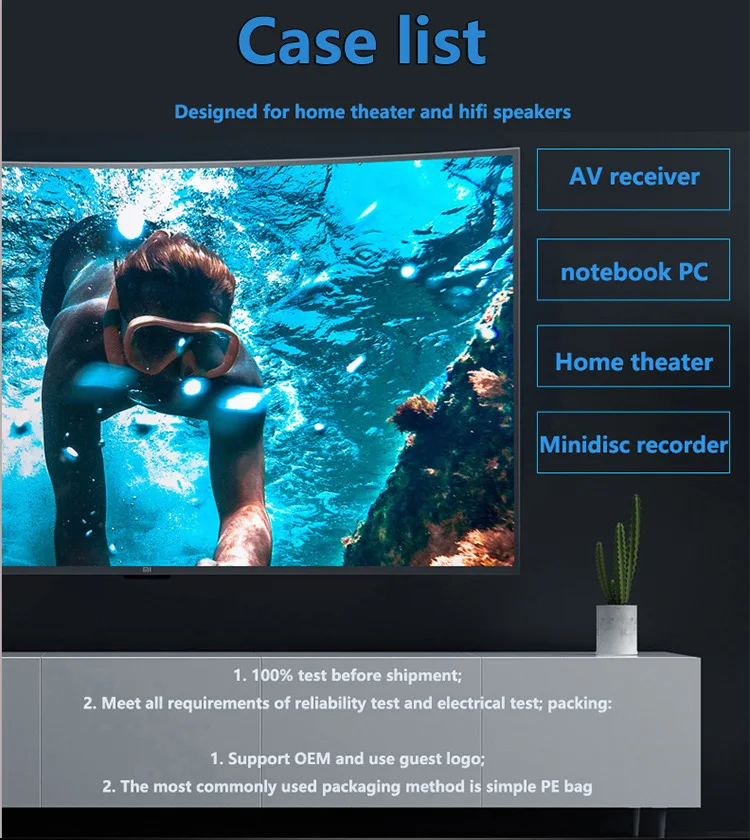 Cable de fibra óptica SPDIF, el núcleo adopta fibra óptica importada PMMA, que tiene baja atenuación y admite la transmisión de audio digital de código fuente SPDIF.