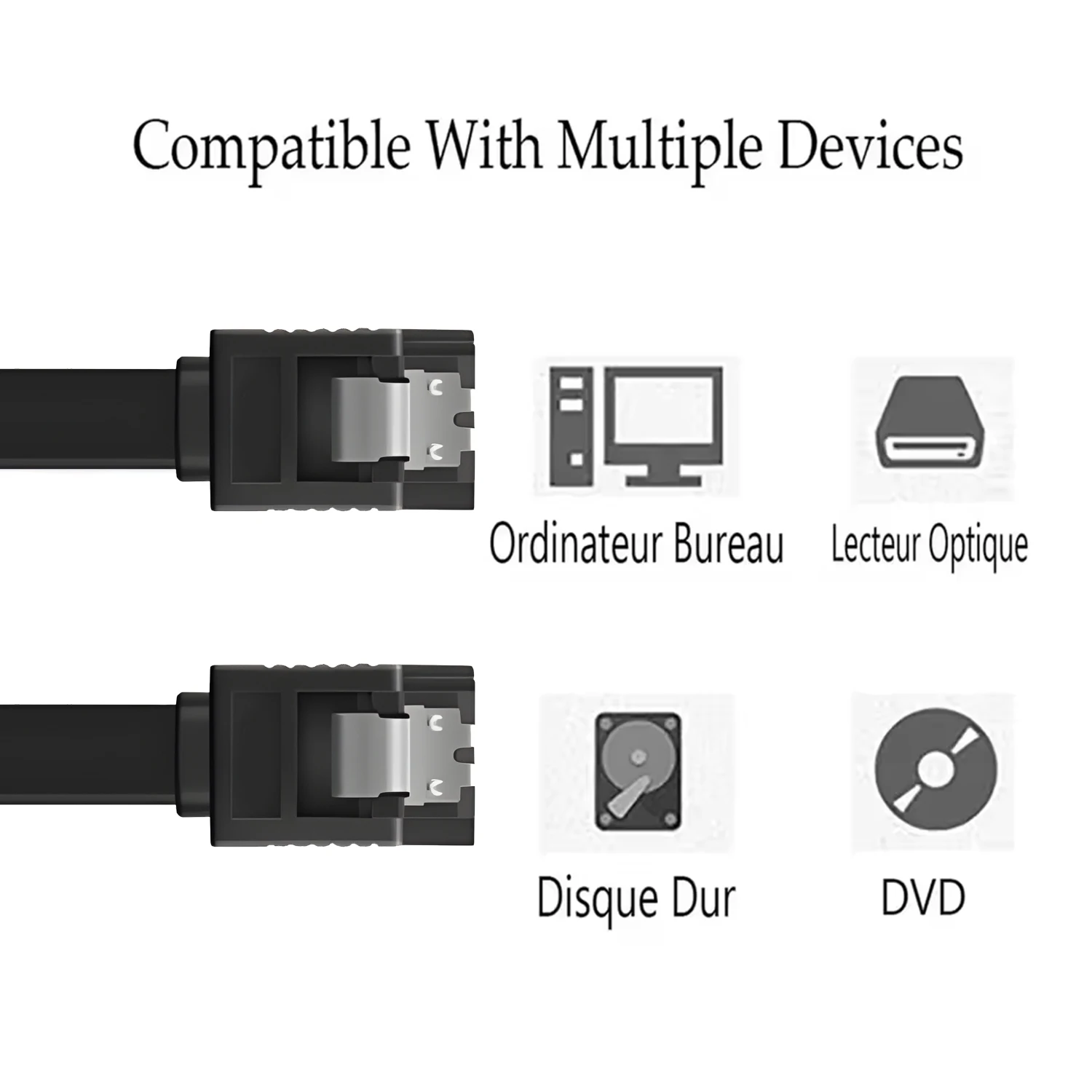 [Transmisión y eficiencia de alta velocidad]: como SATA 3 estándar.0 cable de datos, cuenta con velocidades de transferencia de hasta 6 Gbps, lo que permite transferencias rápidas de archivos grandes, ya sea transmite videos de alta definición o datos de juegos a gran escala, sin esperas, lo que mejora la eficiencia del intercambio de datos de la computadora.[Ampliamente compatible]: Compatible con dispositivos conectados a SATA, como discos duros mecánicos, unidades de estado sólido, unidades ópticas, reproductores/grabadoras de DVD y computadoras de escritorio, le permite ampliar capacidades de almacenamiento y lectura/escritura en múltiples dispositivos, fácilmente satisfaciendo diversas necesidades.[Estable y confiable]: el diseño del clip de resorte de acero de doble extremo bloquea de forma segura la interfaz, evitando que se caiga durante el uso.Esto evita interrupciones de datos y fallas de reconocimiento del dispositivo causadas por un mal contacto, lo que garantiza un funcionamiento estable del dispositivo.[Duradero y resistente al óxido]: los contactos de la interfaz chapados en oro permanecen libres de óxido y ofrecen una fuerte resistencia a la oxidación, extendiendo la vida útil del cable.El cuerpo del cable de PVC ignífugo es resistente al calor y a las roturas, lo que lo hace adecuado para entornos complejos que se encuentran en el chasis de la computadora.Diseño flexible y conveniente: el cable flexible de cobre de 8 núcleos permite un enrutamiento flexible, enrutando fácilmente alrededor de otro hardware dentro del chasis.Simplifica la gestión de cables, mantiene el interior limpio y organizado y reduce el riesgo de que el cable se doble.Durable y sin preocupaciones. Material: núcleo de cobre, cubierta de PVCTamaños: unos 30 cm, 39 cm, 1 MCaracterísticas: Transmisión de alta velocidad, amplia compatibilidad, estable y resistente al deslizamiento, duradero y resistente al óxido, flexible y fácil de enrutar.Color negroCompatible con: computadoras de escritorio, discos duros/SSD mecánicos, unidades ópticas y otros dispositivos de interfaz SATA El paquete incluye: 1 * Cable de datos