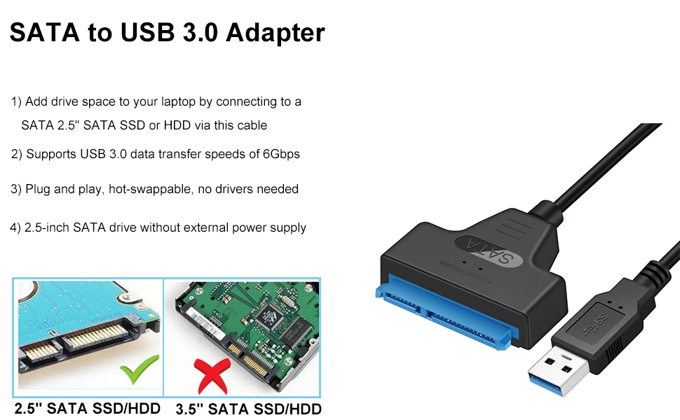 1. Adpter SATA III Cable USB 3.0 Disco duro externo USB a Serial ATA Convertidor de 22 pines Disco duro 6 Gbps para HDD/SSD de 2,5".