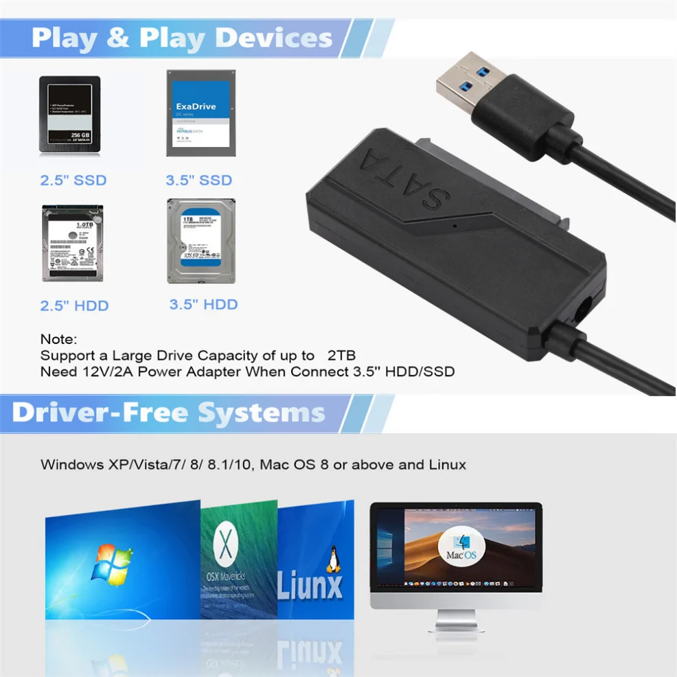 Nota importante: 1.No se requiere energía adicional para HDD/SSD de 2,5". 2.Para HDD/SSD de 3,5", conecte el adaptador de corriente de 12 V/2 A para una transmisión estable. 3.NO es compatible con dispositivos combinados de DVD BLU-RAY, CD-ROM, DVD-ROM, CD-RW, DVD+RW. 【Acceso rápido a HDD SSD SATA de 2,5/3,5 pulgadas】 El cable adaptador SATA a USB 3.0 le permite conectar cualquier gabinete móvil HDD SATA estándar de 2,5" o 3,5" a su computadora/portátil a través del puerto USB 3.0.Es ideal para realizar copias de seguridad de archivos o actualizar el disco duro de su computadora portátil/PC 【Plug & Play Reconocido simple】 El adaptador USB a SATA de 2,5 3,5 pulgadas le permite intercambiar fácilmente archivos de transferencia, entre unidades sin necesidad de instalar el SSD/HDD dentro de un gabinete.compatible con plug-and-play y Hot-swap, 【Amplia compatibilidad】 Este adaptador de disco duro a USB cable sata a USB (SATA 7+15 12 pines) es compatible con PS4, Xbox, Windows 10/8.1/8/7/Vista/XP, Mac OS.intercambio en caliente, plug and play.