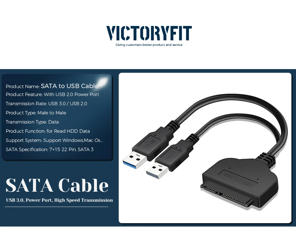 2.Este cable convertidor USB 3.0 a SATA conecta cualquier disco duro SATA estándar de 2,5 pulgadas o unidad de estado sólido (SSD) a una computadora a través de puertos USB 3.0.Es ideal para realizar copias de seguridad de archivos o actualizar el controlador duro de su computadora portátil.