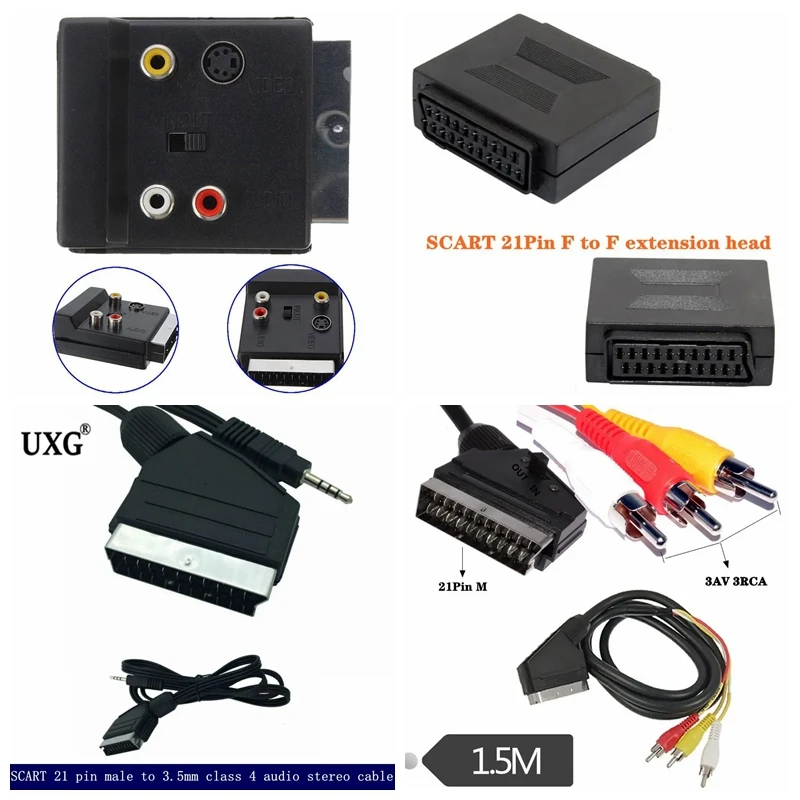 Se utiliza para conectar computadoras satelitales, así como máquinas con función de enchufe europeo de 21 pines (cabezal de escoba) a televisores y otros cables.