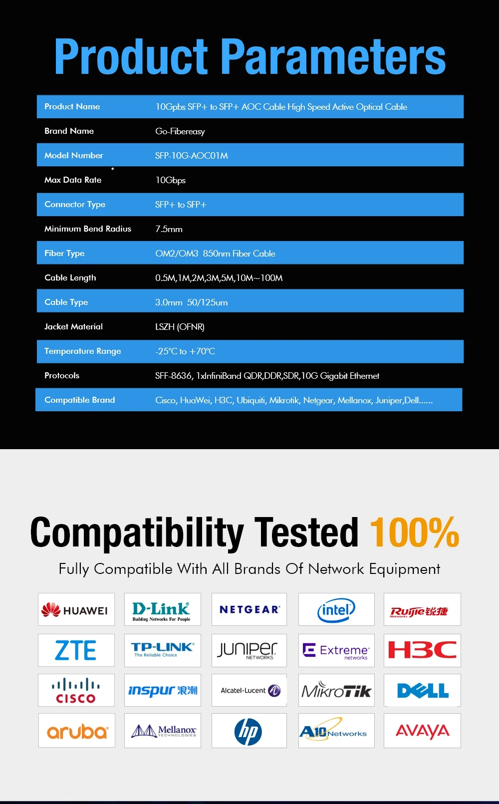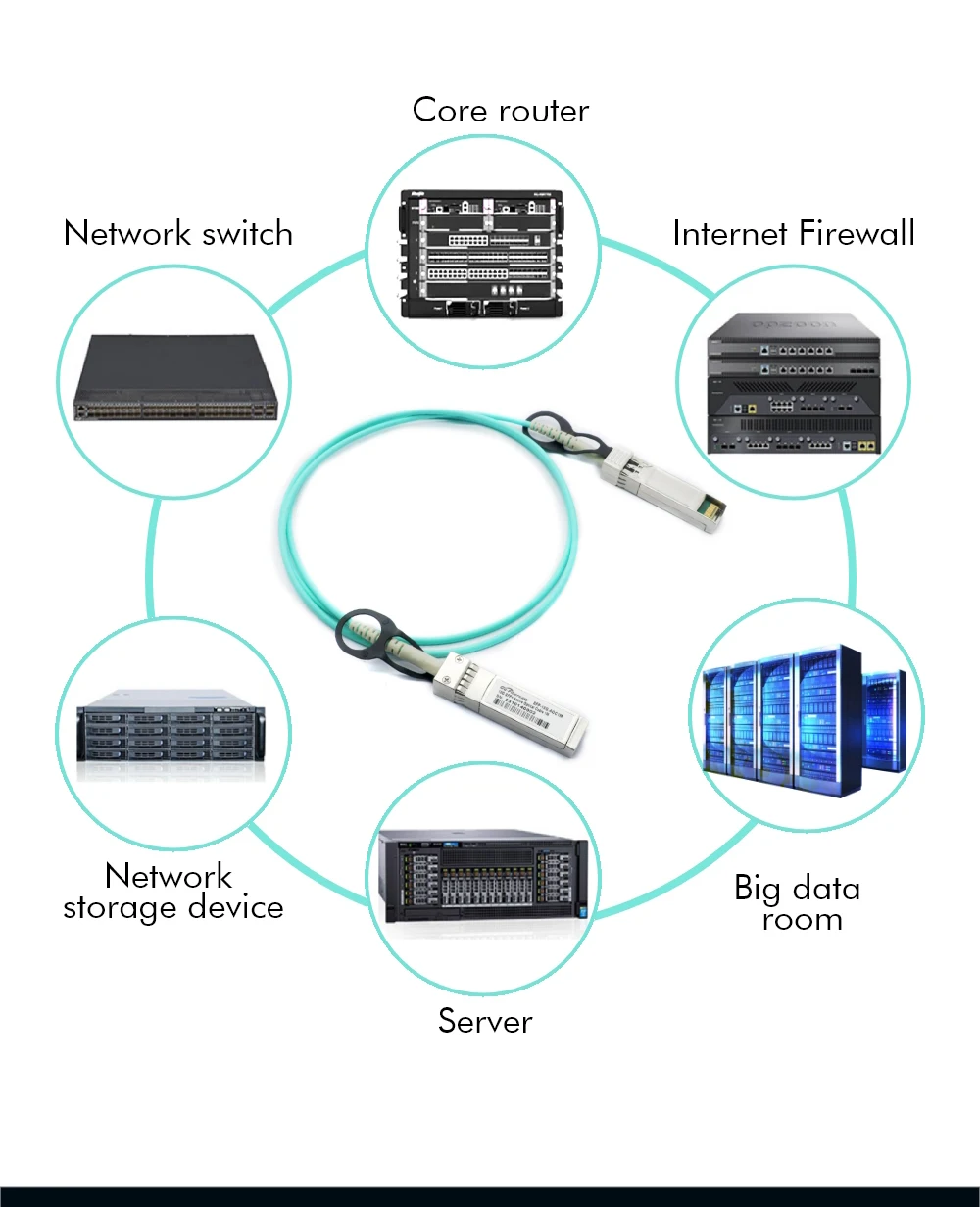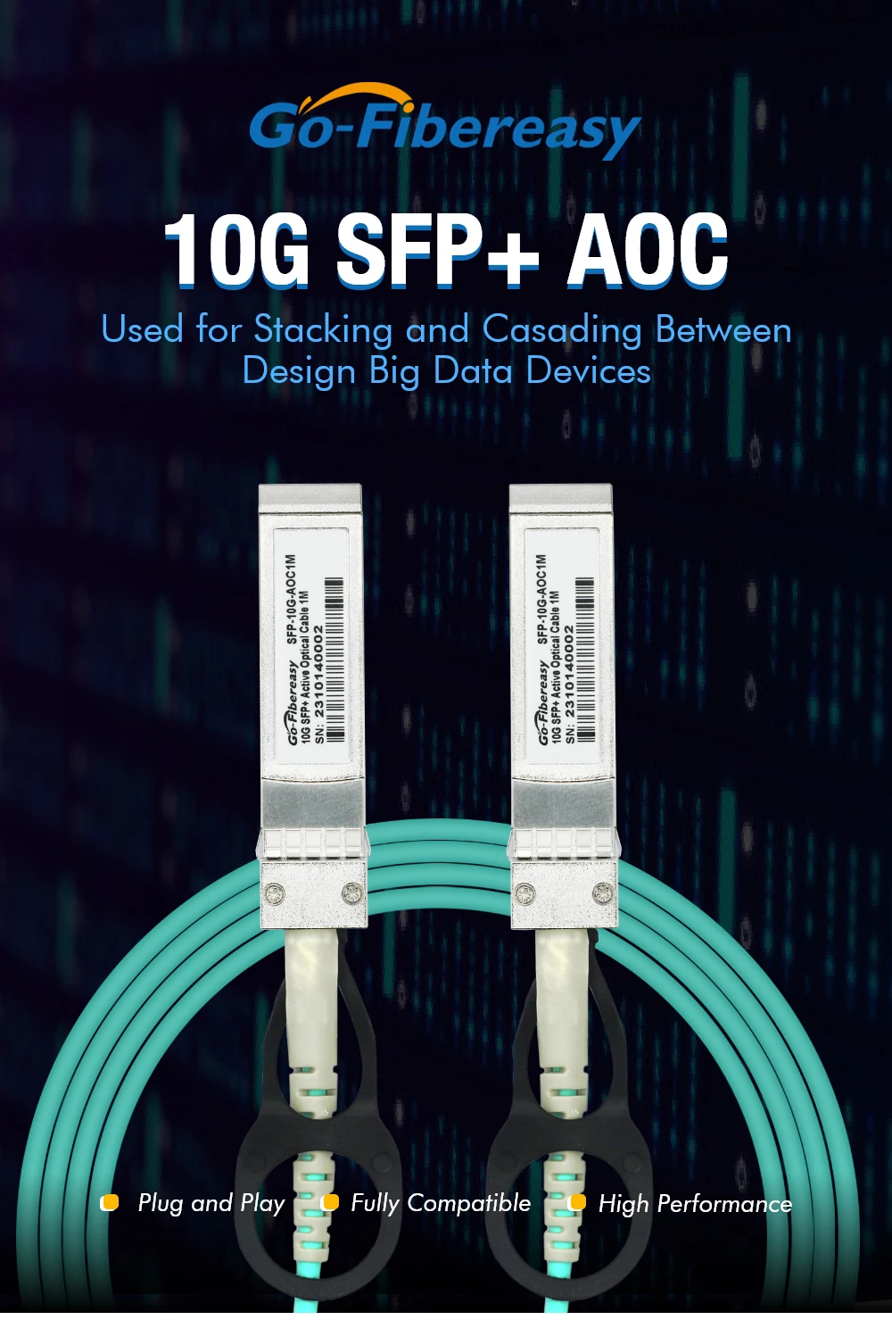 SFP+ AOC (Cable óptico activo) consta de 2 módulos SFP+ y un conjunto de cable de fibra, que transmite hasta 10 Gbps en cada dirección a través de un OM3 MMF con una distancia de hasta 100 m. SFP+ AOC se puede utilizar como una solución alternativa al SFP+ DAC (o al transceptor SFP+), al tiempo que proporciona una integridad de señal mejorada, distancias más largas, inmunidad electromagnética superior y un mejor rendimiento de tasa de error de bits.
