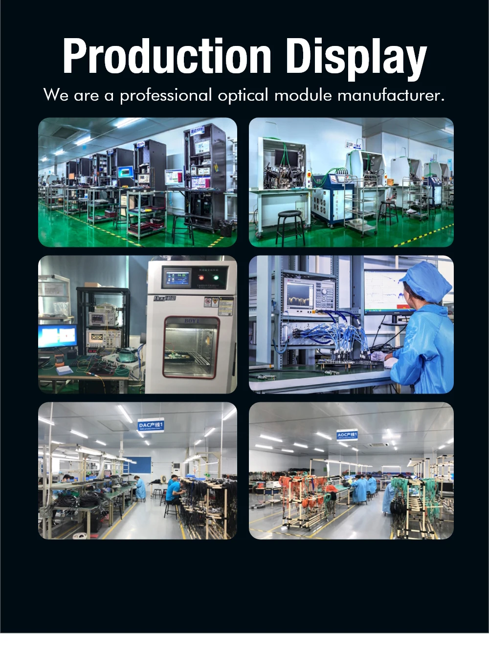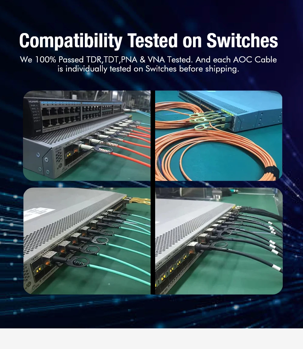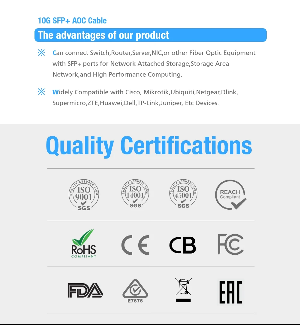 SFP+ AOC (Cable óptico activo) consta de 2 módulos SFP+ y un conjunto de cable de fibra, que transmite hasta 10 Gbps en cada dirección a través de un OM3 MMF con una distancia de hasta 100 m. SFP+ AOC se puede utilizar como una solución alternativa al SFP+ DAC (o al transceptor SFP+), al tiempo que proporciona una integridad de señal mejorada, distancias más largas, inmunidad electromagnética superior y un mejor rendimiento de tasa de error de bits.